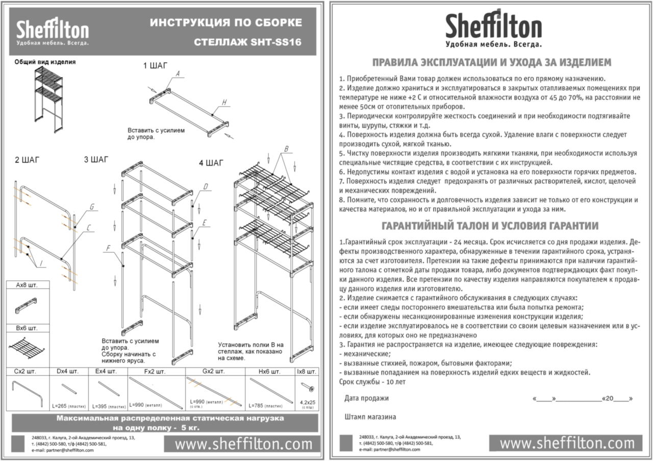- Максимальная распределенная нагрузка на одну полку - 5 кг.;