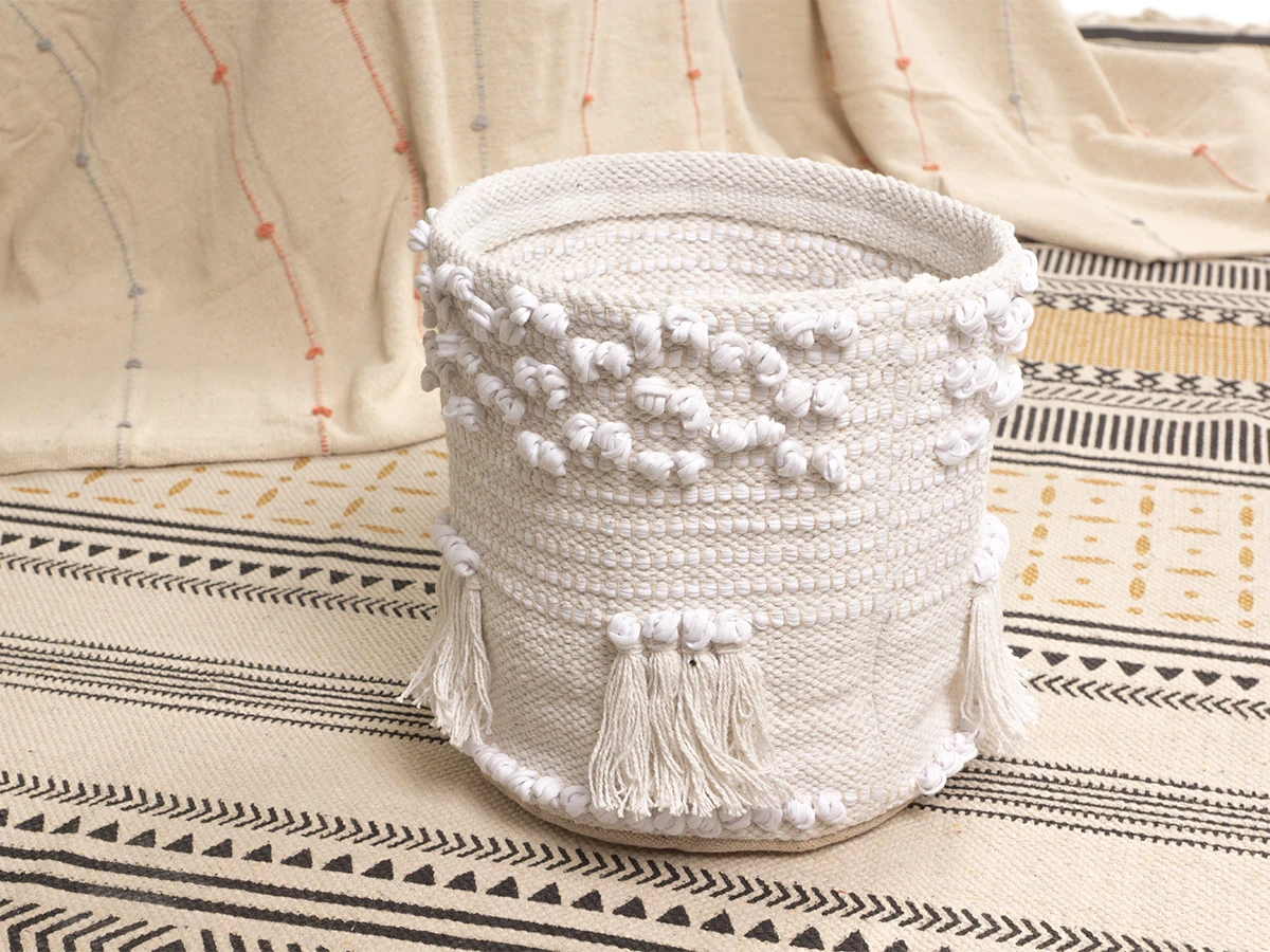 Круглая корзина из хлопка с плотными стенками и мягким дном станет функциональной и эстетичной деталью интерьера. В ней можно организовать удобное хранение косметики, игрушек, журналов, техники, материалов для рукоделия и творчества, использовать в качестве кашпо для цветов, растений, декоративных композиций. Хлопок обладает высокой прочностью и превосходными тактильными характеристиками. Корзинка украшена бахромой, рельефным геометрическим орнаментом, что делает ее оригинальной и акцентной. Плетеная корзинка с этническими мотивами добавит шарма в интерьер, сделает его более самобытным и поможет отразить вкусы его владельца. Станет теплым запоминающимся и полезным подарком, прекрасным аксессуаром, который красиво дополнит любое пространство.