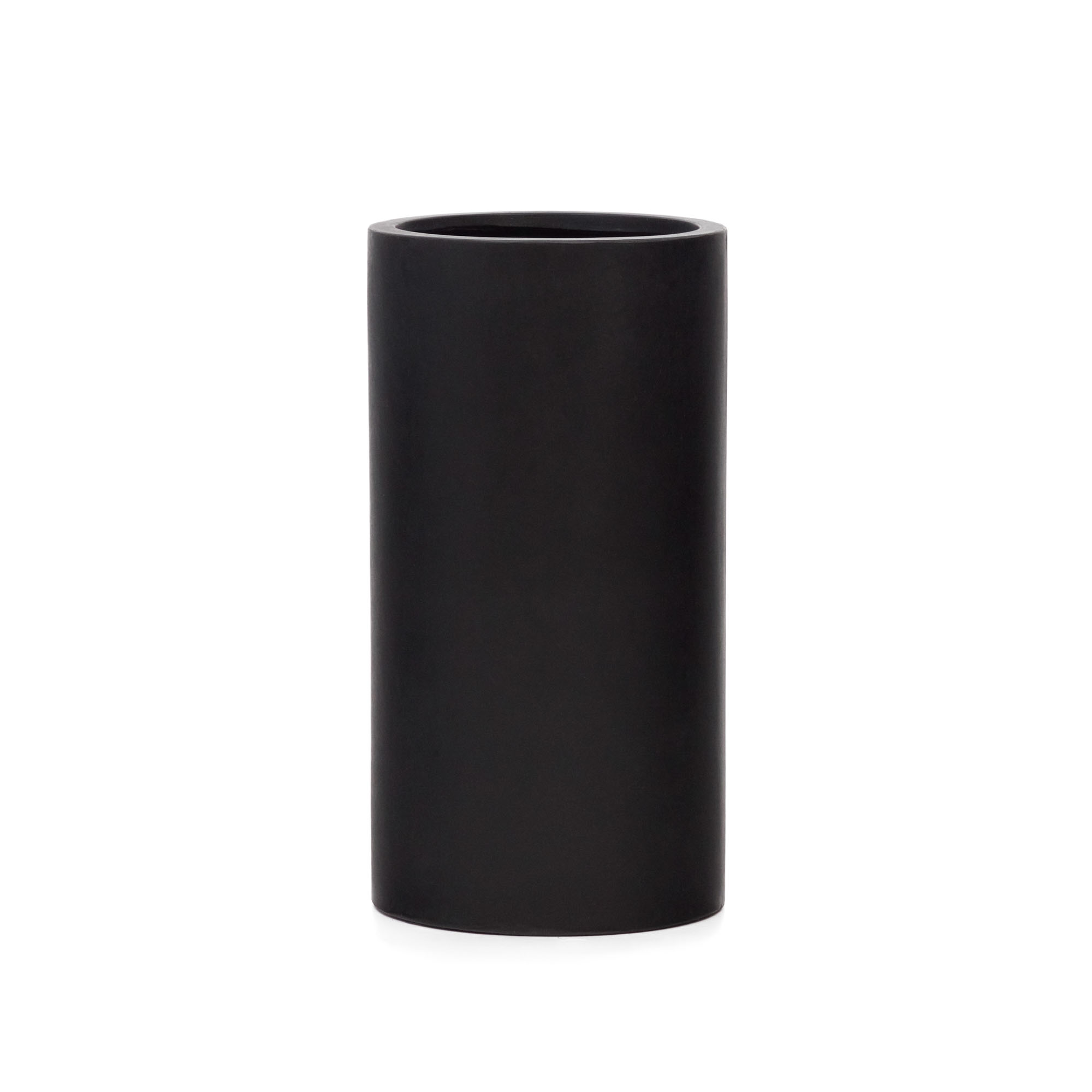 Кашпо имеет обтекаемую форму. Материал изготовления – цемент, с матовым покрытием черного цвета. Благодаря порошковой технологии нанесения краски, поверхность идеально ровная.