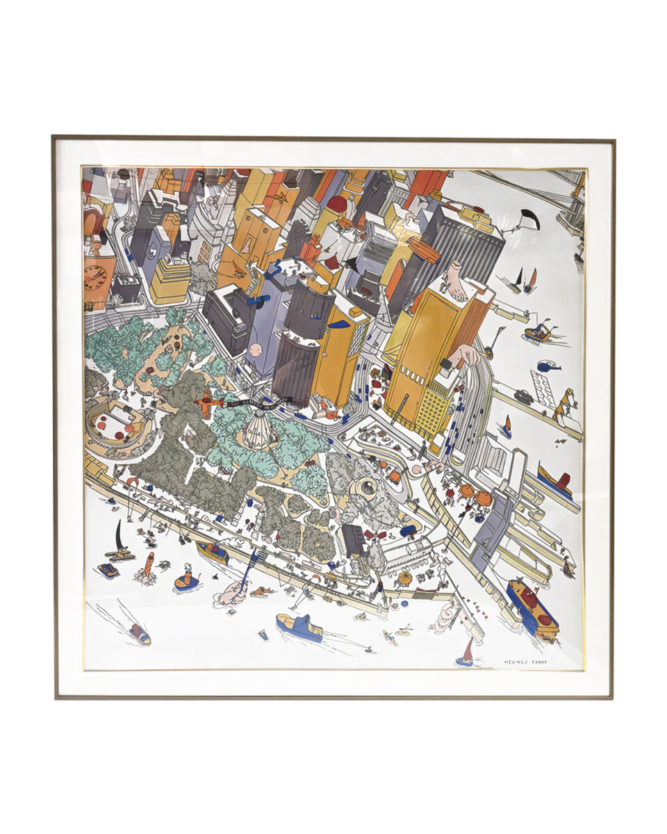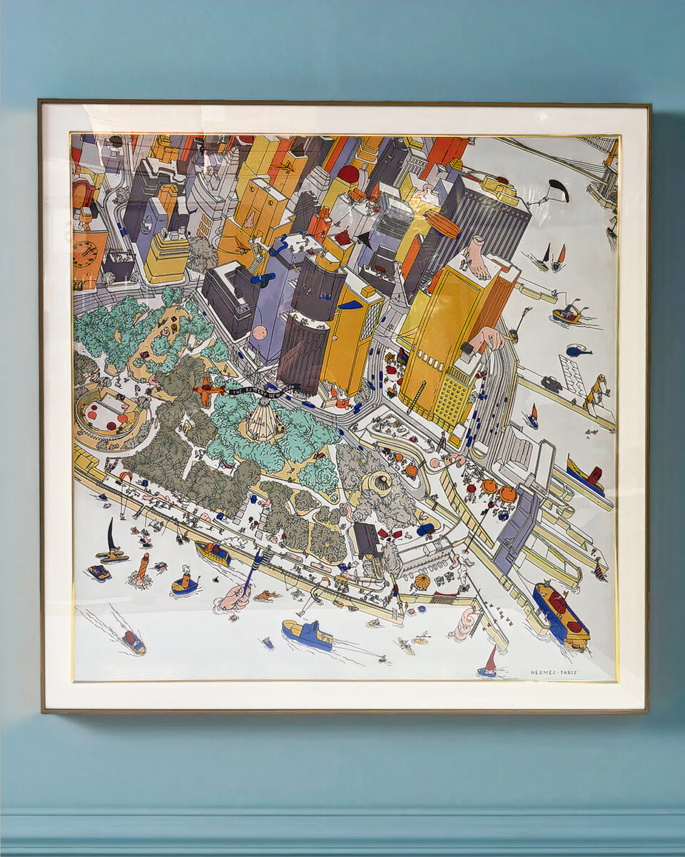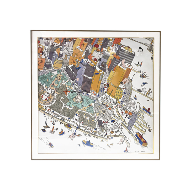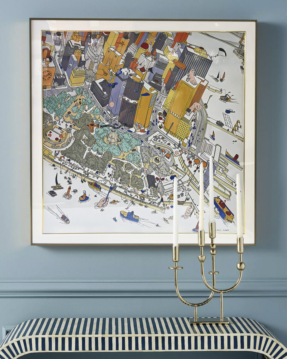 Запросить индивидуальное предложениеИнтерьерное жикле “Battery Park” – это настенный декор с панорамой общественного парка, который расположен в дальнем конце Манхэттена, идущий вдоль реки Гудзон. Произведение имеет игривую и яркую художественную расцветку, которая обрисовывает контуры зданий, небоскребов, растительности и длинную эспланаду у кромки воды, дополняет его множеством удивительных деталей: ступни на вершине башни, монументальной рукой с флагом, выходящей из Гудзона, и множеством маленьких персонажей, занятых разными делами.