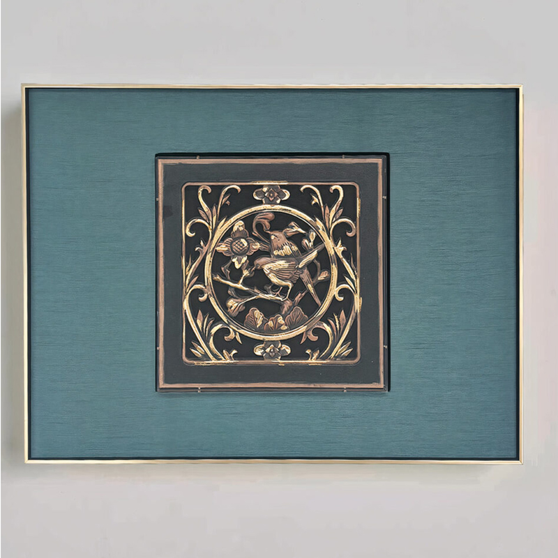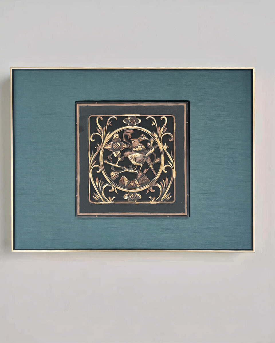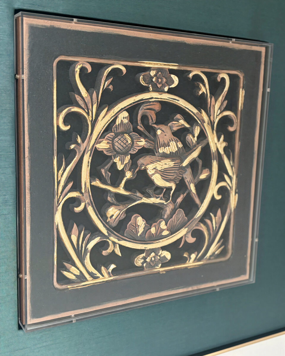 Запросить индивидуальное предложениеЦентральный элемент панно — это изящное рельефное изображение двух птиц, выполненные резьбой по дереву с добавлением золочения . Птицы изображены на фоне стилизованных растительных мотивов в круглой рамке, что создаёт ощущение гармонии и завершенности композиции. Мелкие детали проработаны с невероятной точностью, что делает панель поистине уникальной. Элементы золочения придают изображению мерцающий блеск и глубину.