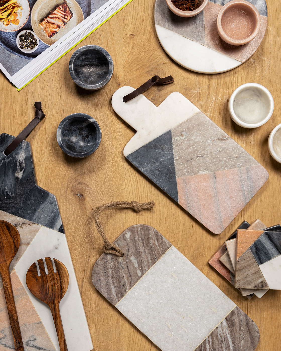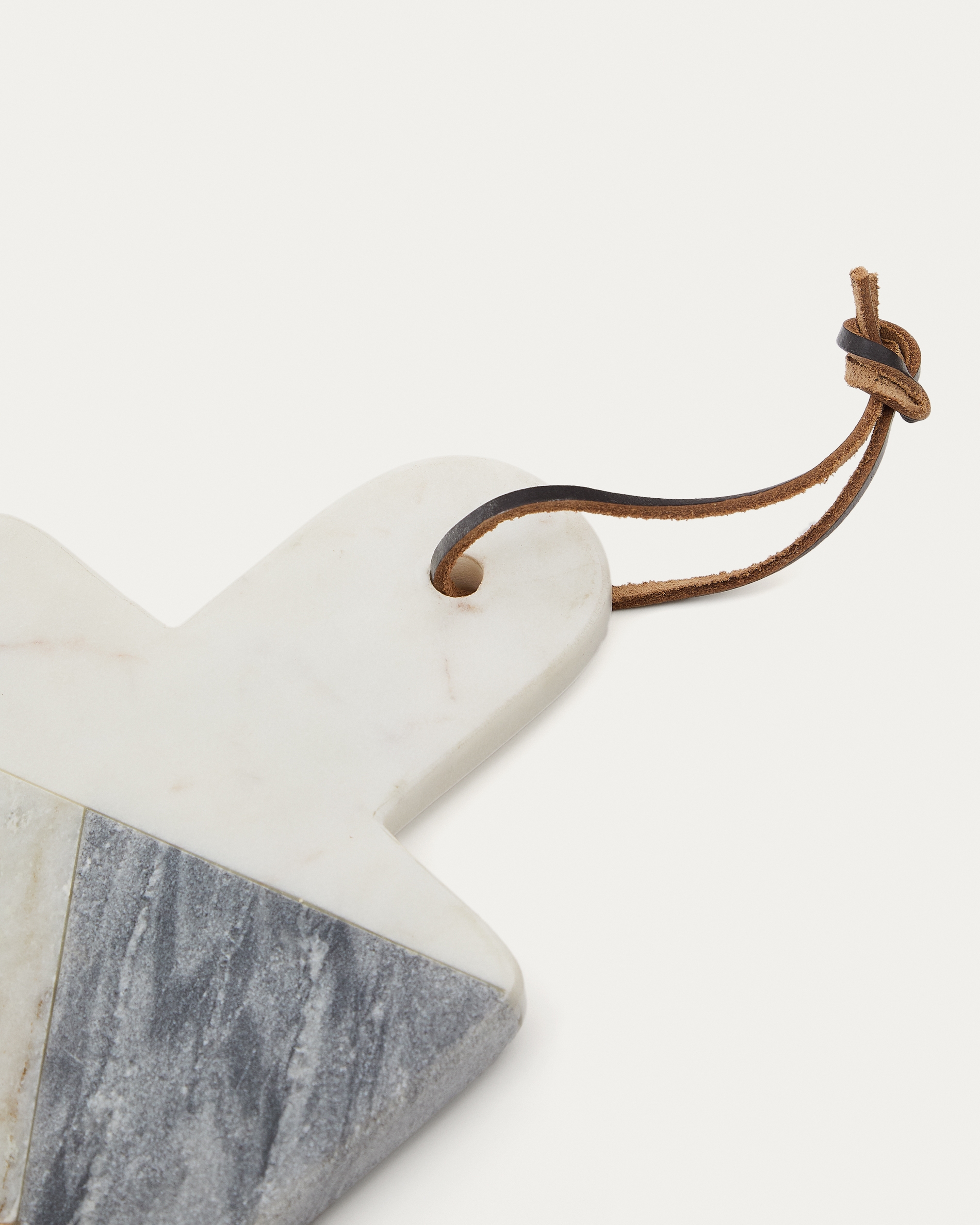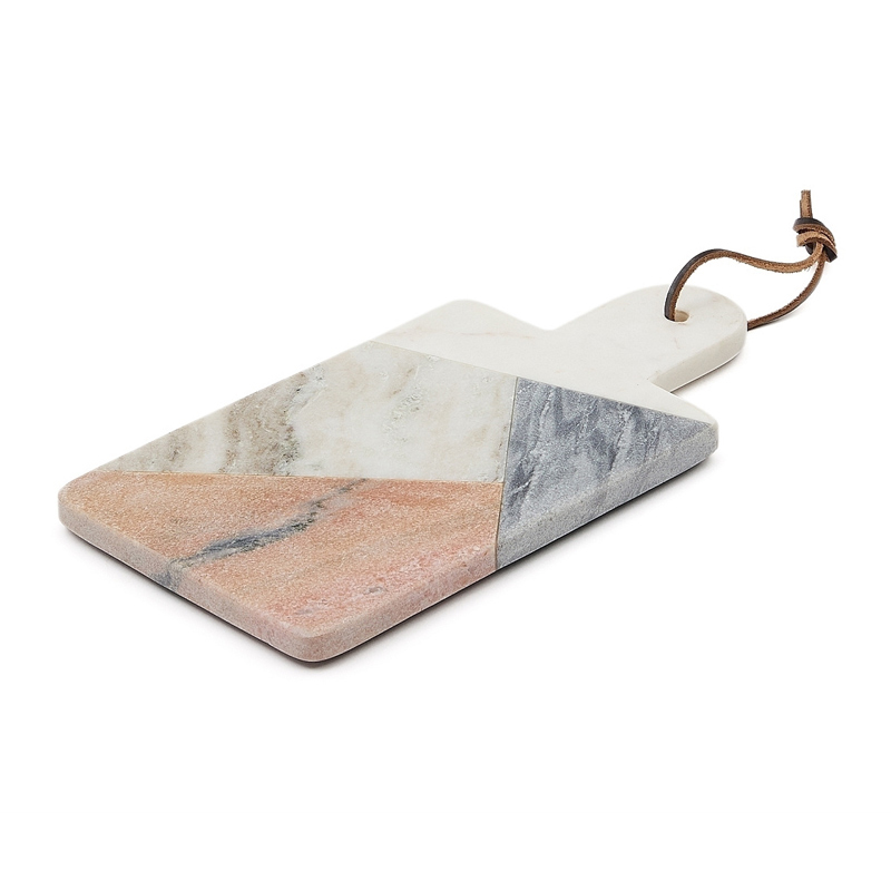 Доска сразу восхищает своим дизайном. И дело вовсе не в форме, а в уникальном соединении в одном изделии сразу четырех видов мрамора. Испанские дизайнеры сделали это удивительно красиво, создав неповторимый геометрический рисунок.