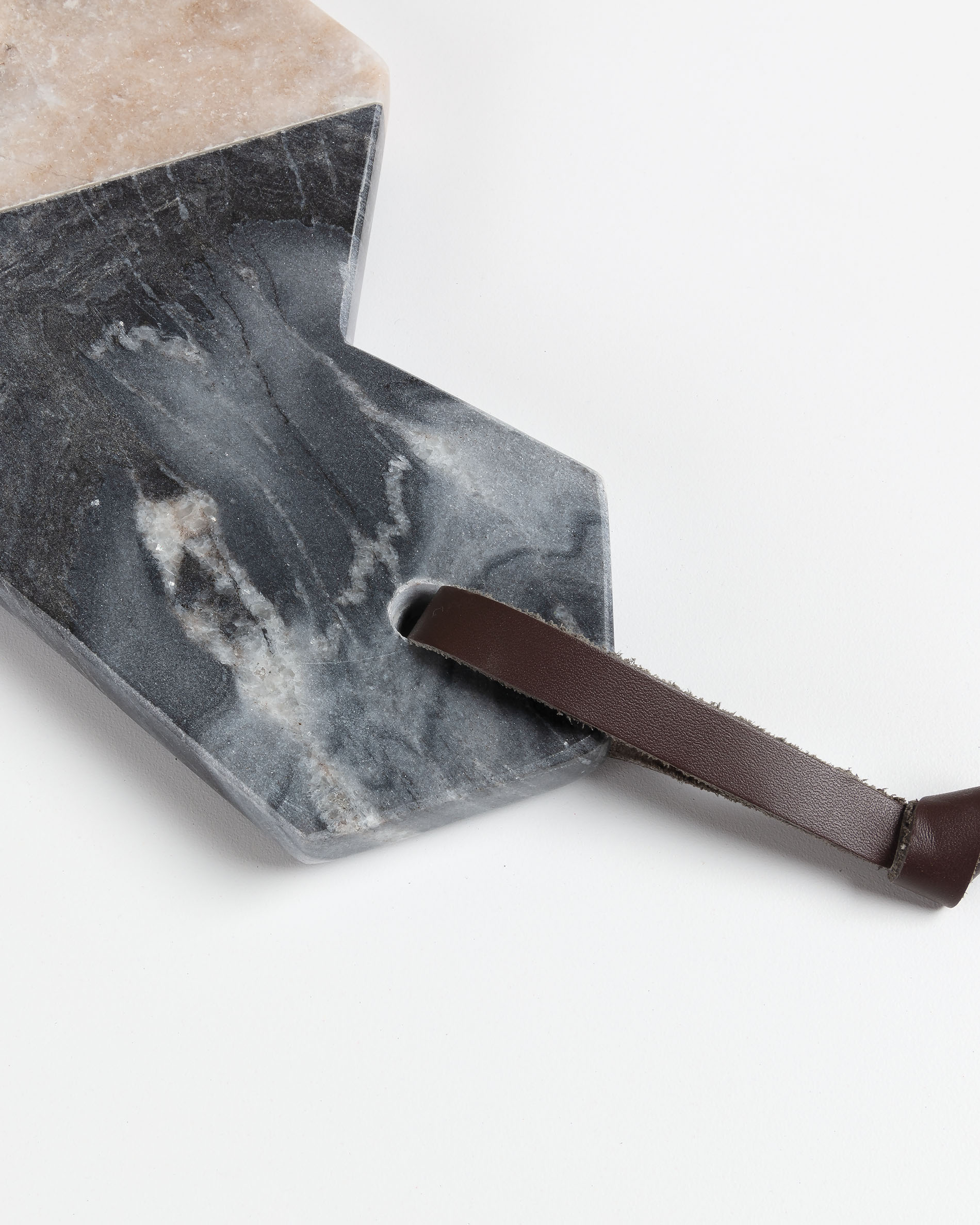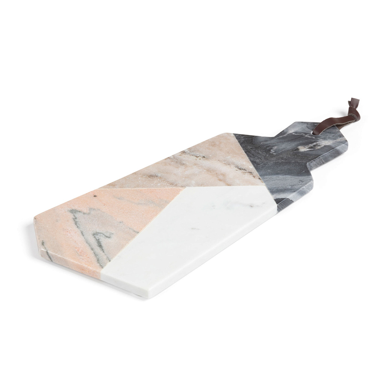 Доска создана только из натуральных материалов — это четыре вида мрамора и подвяз из кожи. Благодаря смелой геометрической комбинации из теплых и холодных оттенков камня, изделие прекрасно будет гармонировать с интерьером в любой цветовой гамме. Стиль также может быть различным — от лофта до средиземноморского.