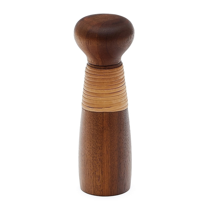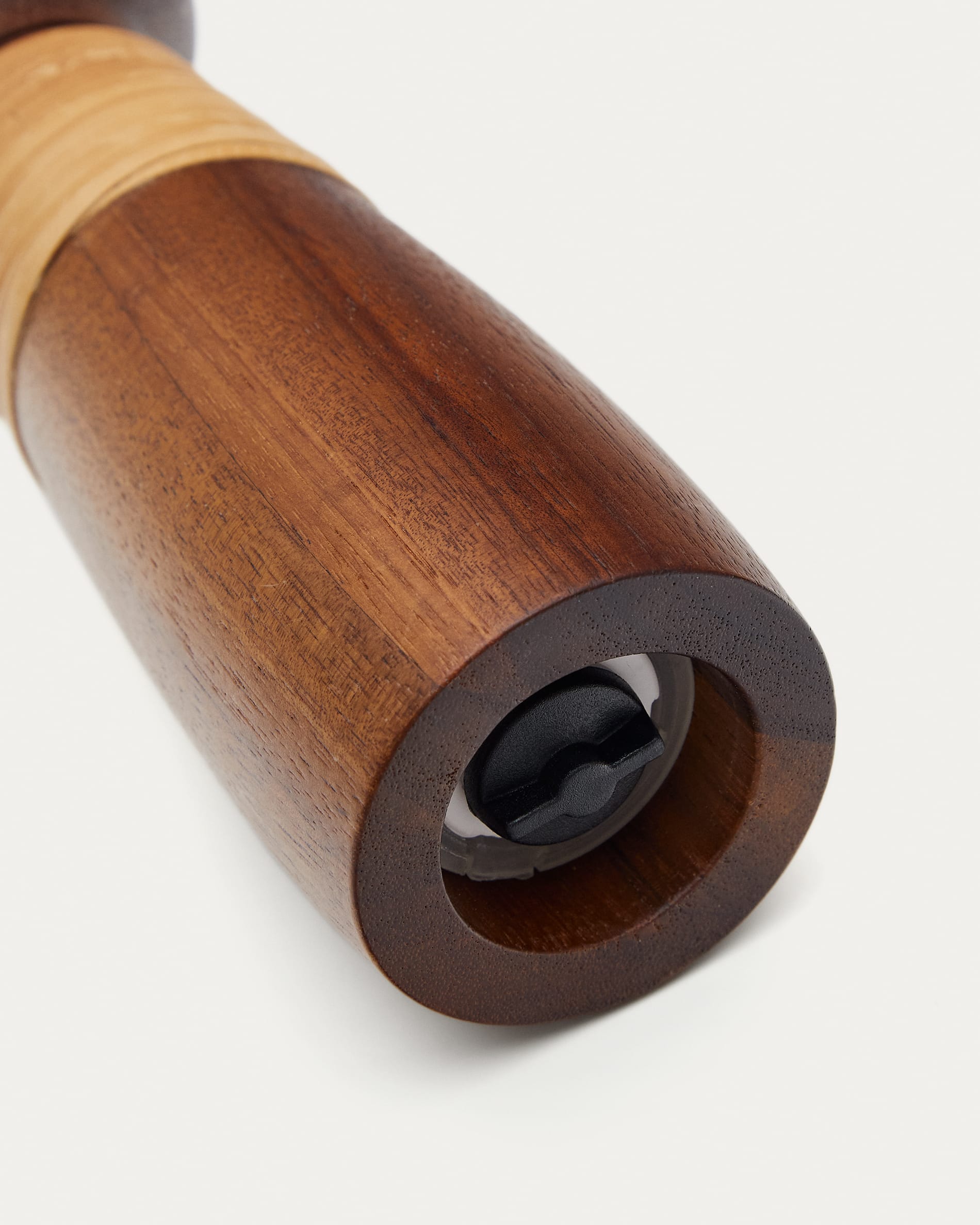 Мельница полностью сделана из древесины акации и частично окантована ротангом. Оба материала представлены в естественном цвете, защищены от влаги и ультрафиолета полиуретановым покрытием. Поворотная часть оснащена надежным измельчителем, который при правильной эксплуатации и уходе прослужит годы.