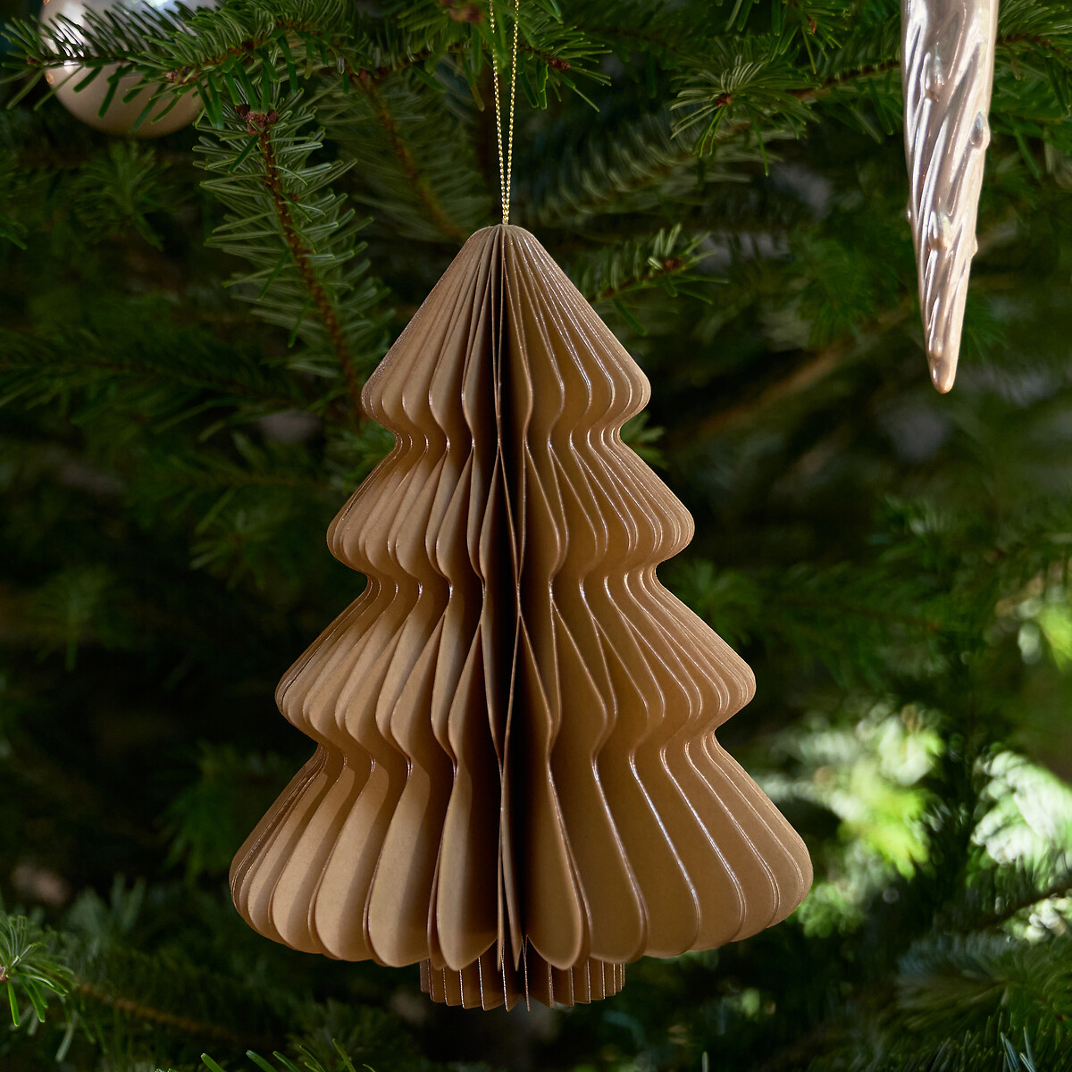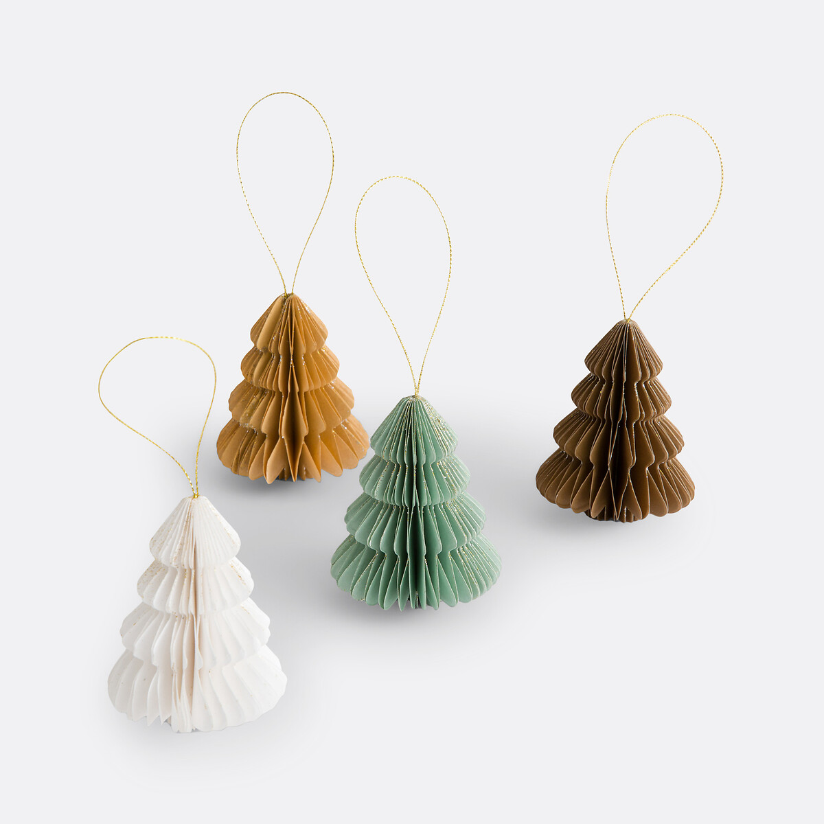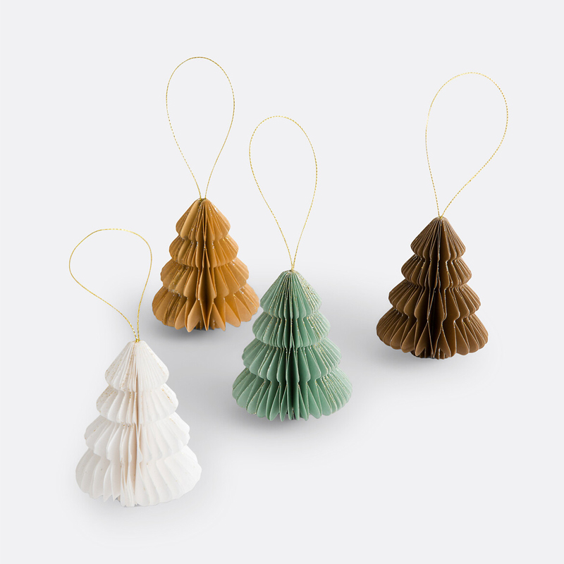 • Комплект из четырех елочек из бумаги FSC, складных и на петельке, отделка блестками
