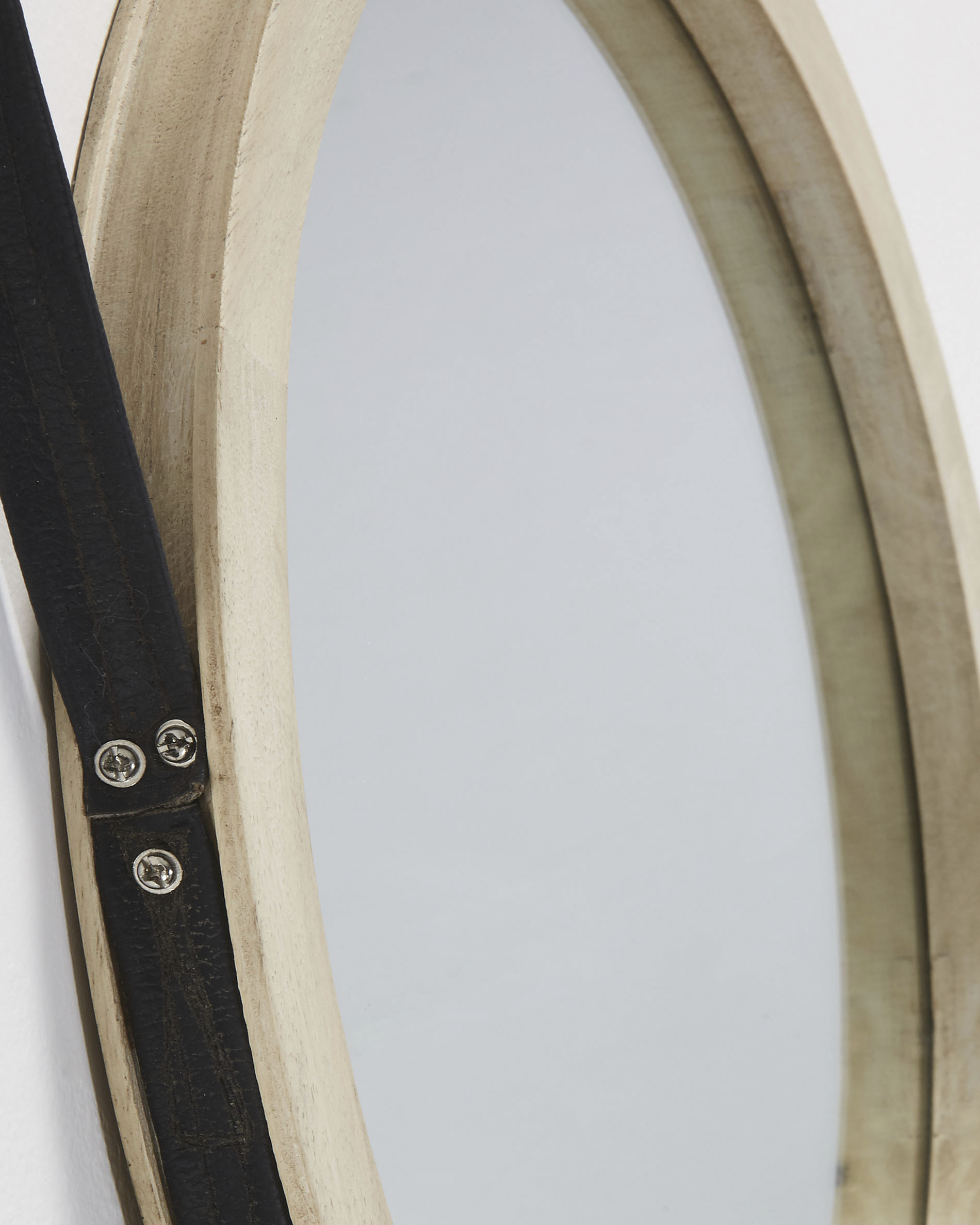 По внешнему контуру есть углубление, в которое вставлен подвес из синтетической кожи. Кожа прочная, будет надежно удерживать зеркало на весу.