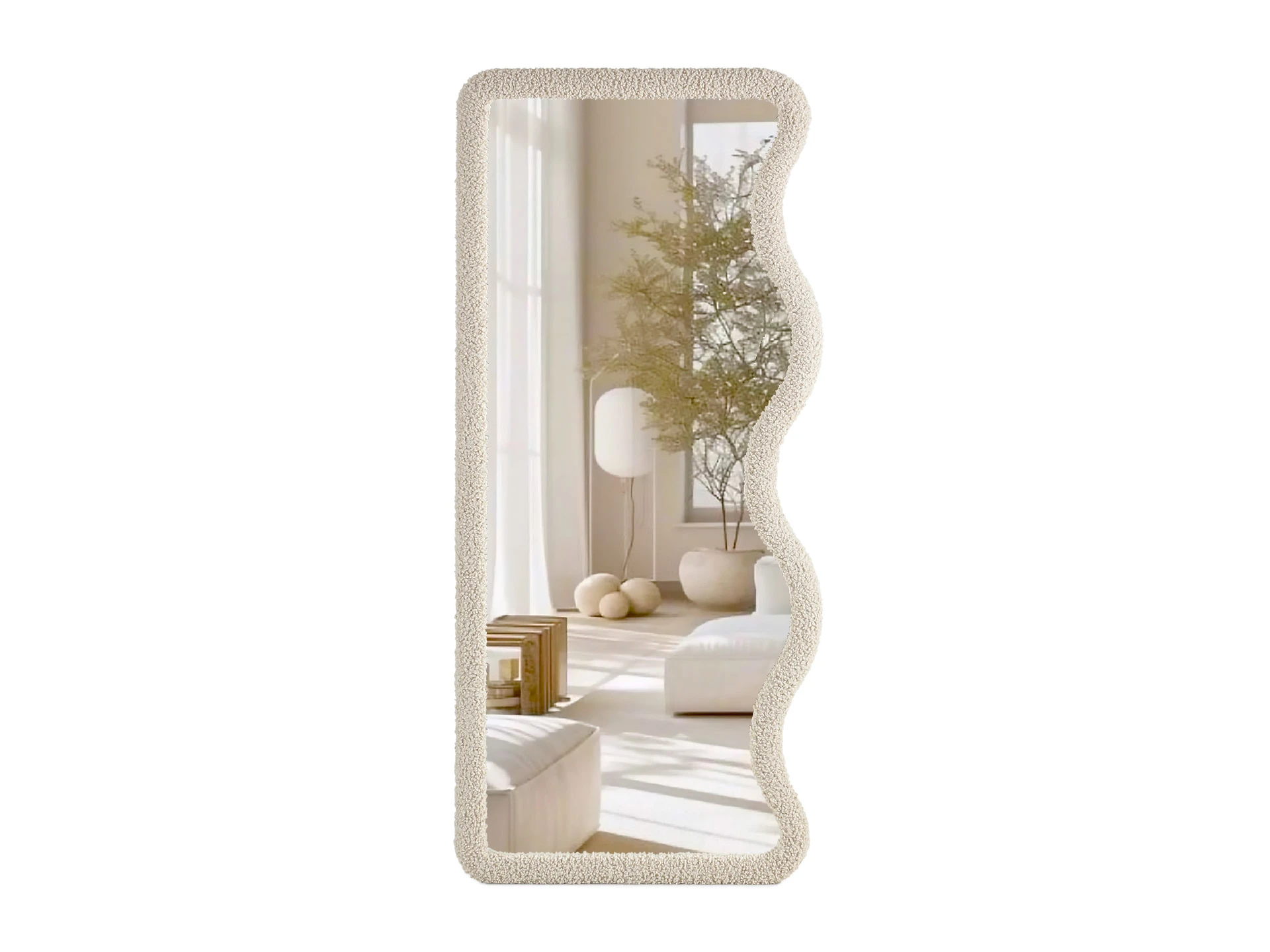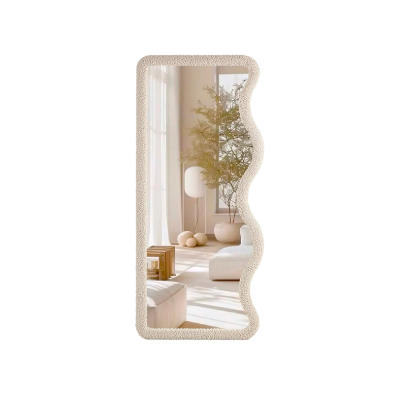 Запросить индивидуальное предложениеНапольное фигурное зеркало Francis выделяется оригинальной геометрией. Волнистый край контрастирует с прямыми линиями, поддерживает тренд на плавные формы и активную геометрию в интерьере. Рама выполнена из МДФ, обтянута фактурной тканью «букле». Что добавит в ваш интерьер тактильности, глубины, многослойности. Размер зеркального полотна 75x175 см — можно увидеть себя в полный рост.
