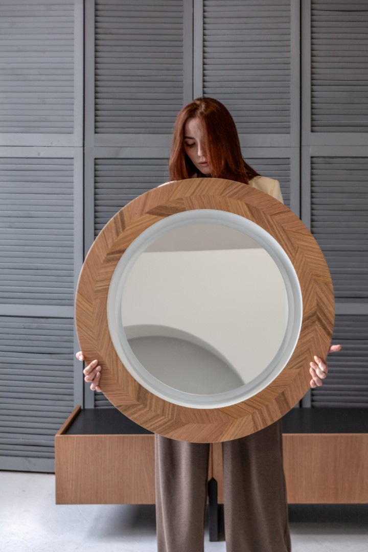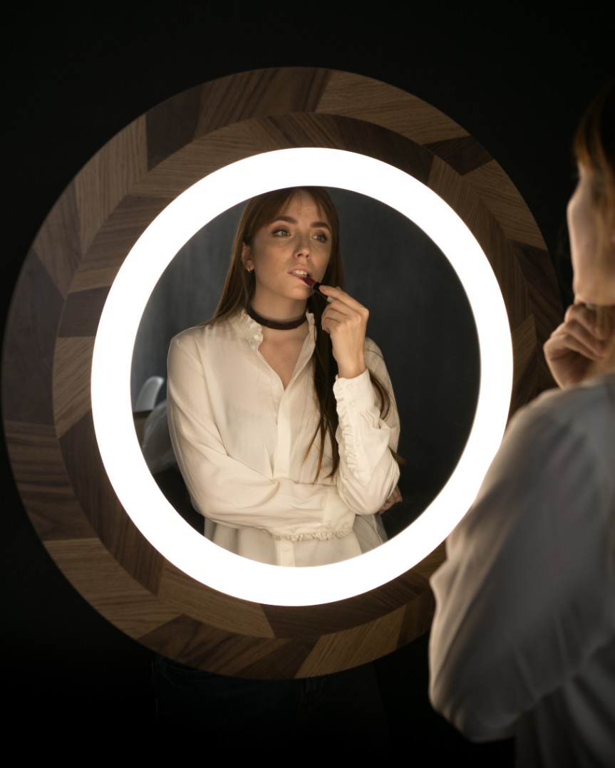 МДФ, влагостойкое зеркальное полотно, натуральный шпон, прозрачный матовый лак, золотая поталь, светодиодное оборудование Arlight