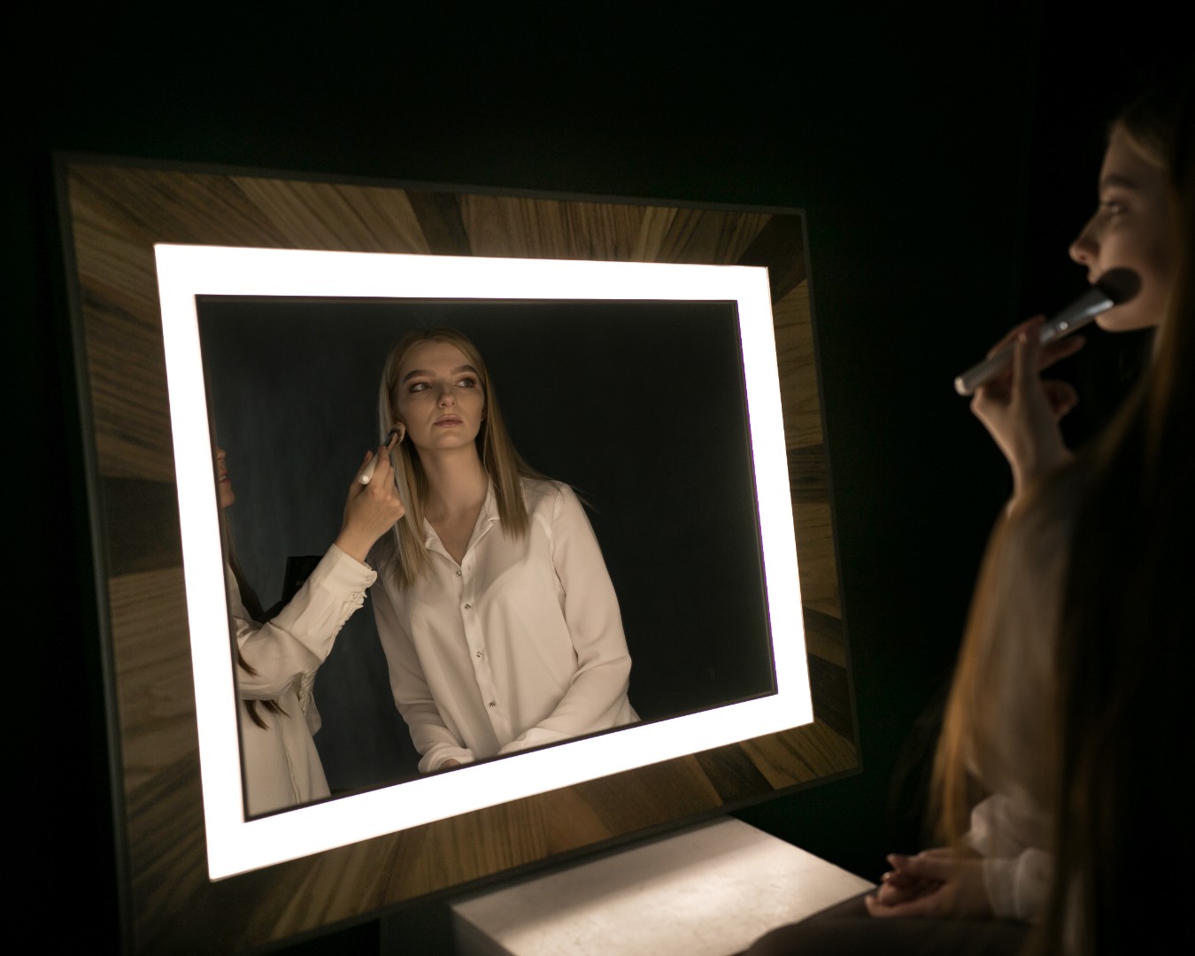 МДФ, влагостойкое зеркальное полотно, натуральный шпон разных пород, прозрачный матовый лак, цветная эмаль, светодиодное оборудование Arlight