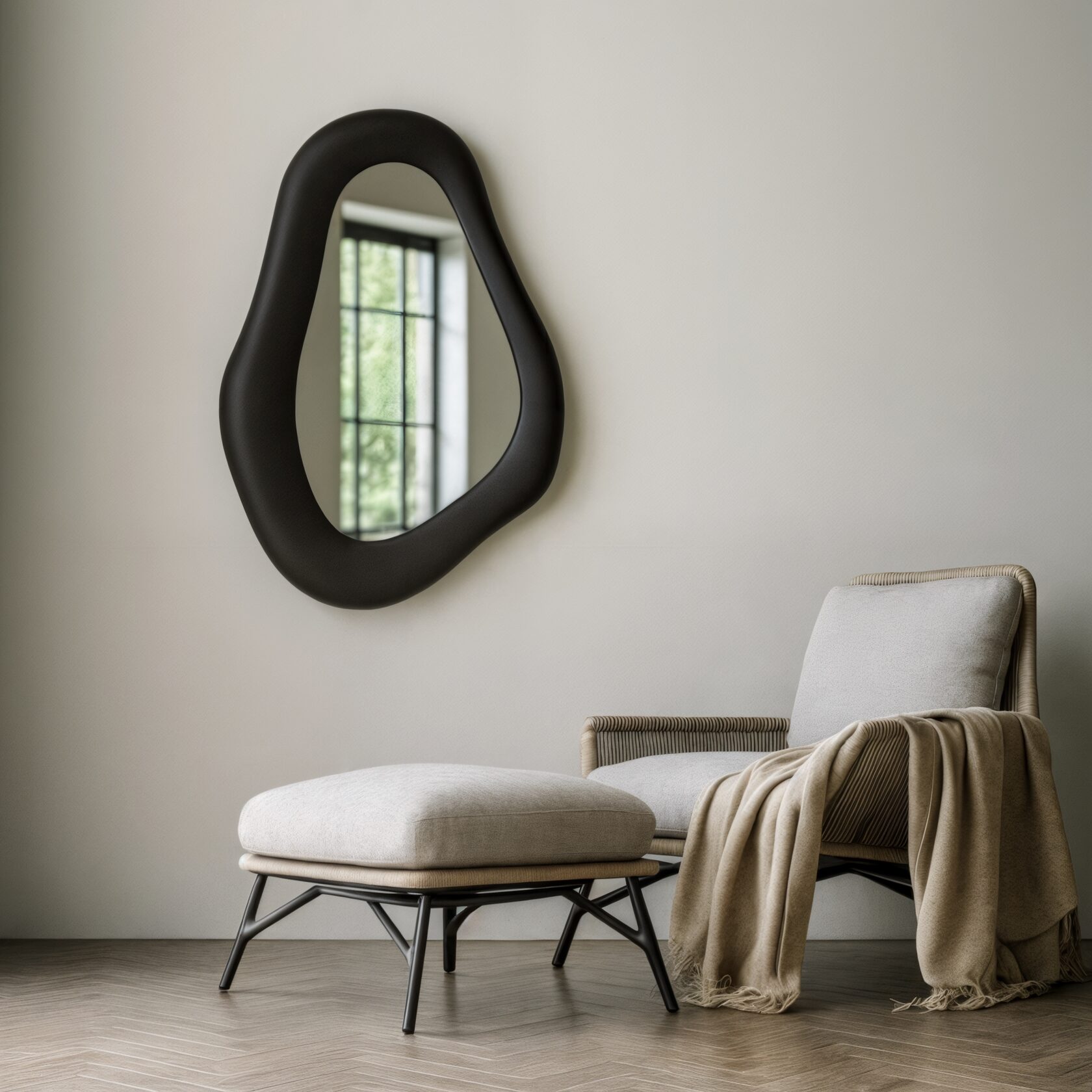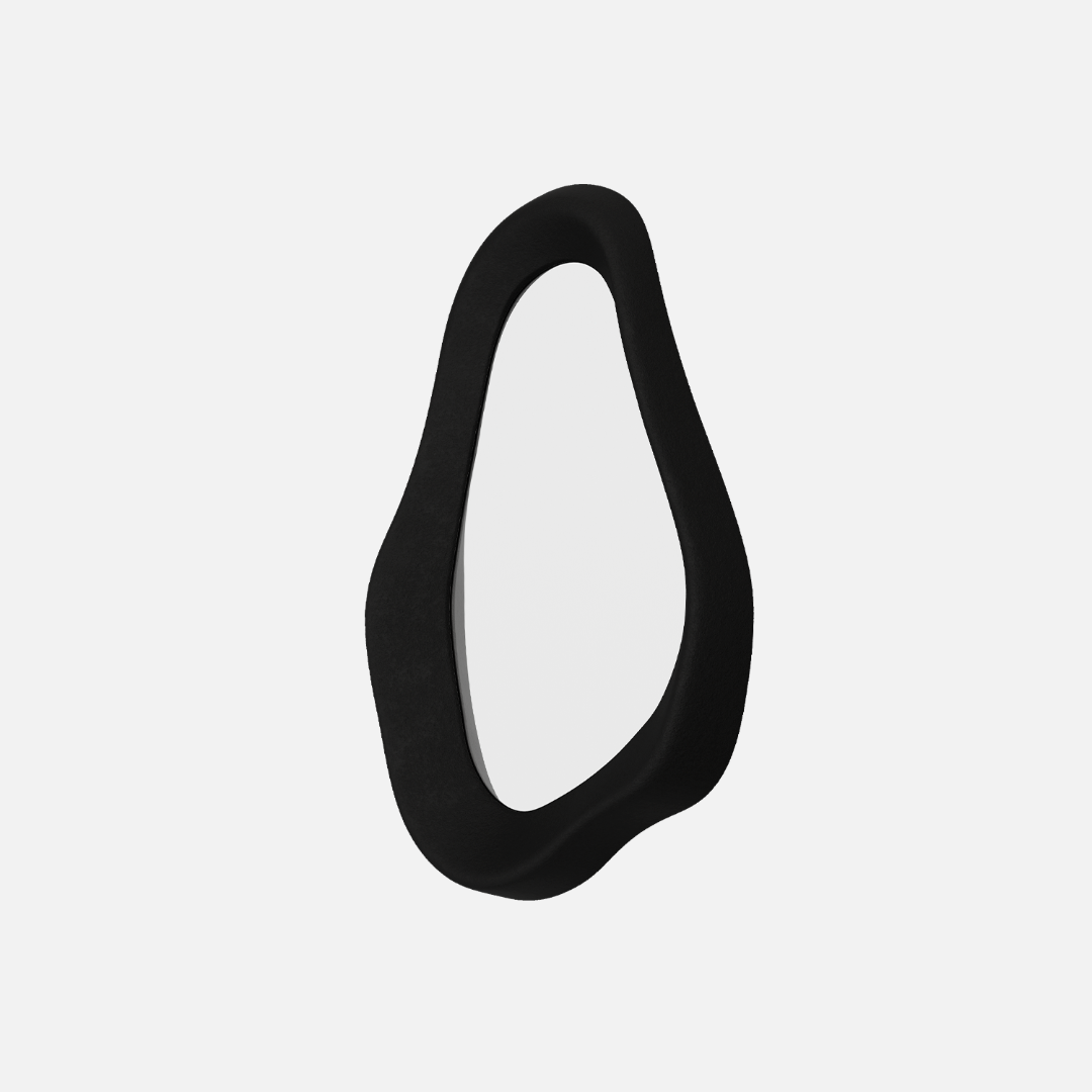 Запросить индивидуальное предложениеИнтерьерное зеркало ручной работы с органичным «галечным» силуэтом и матовой объемной рамой угольного цвета. Графичный тон создает архитектурный контраст, структурирует пространство и усиливает игру света.