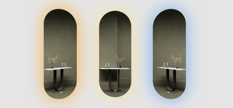- Подсветка 3 в 1: Позволяет регулировать температуру и яркость света. Меняйте цвет одним касанием, а яркость — удержанием кнопки. Все выбранные вами настройки зеркало сохранит автоматически.