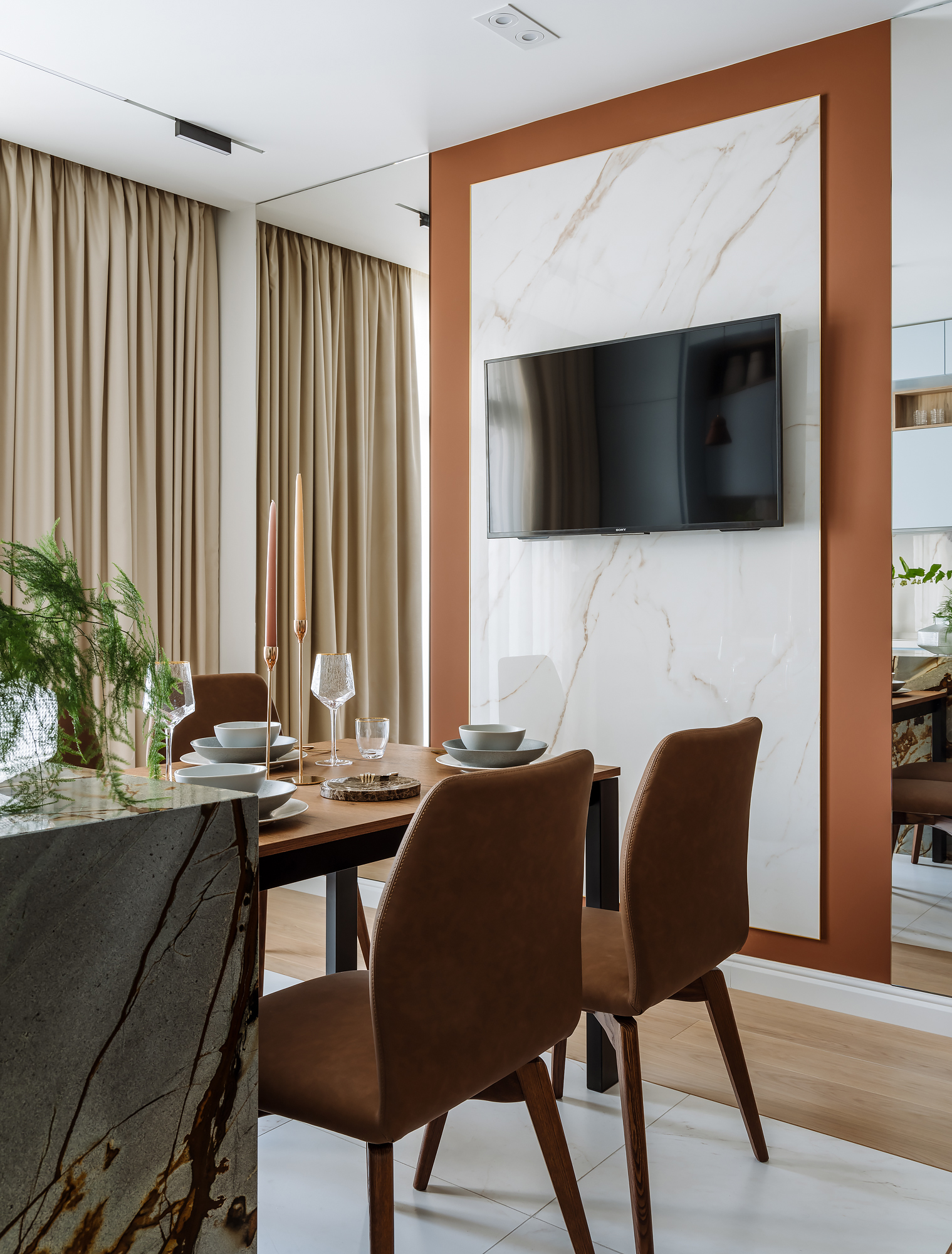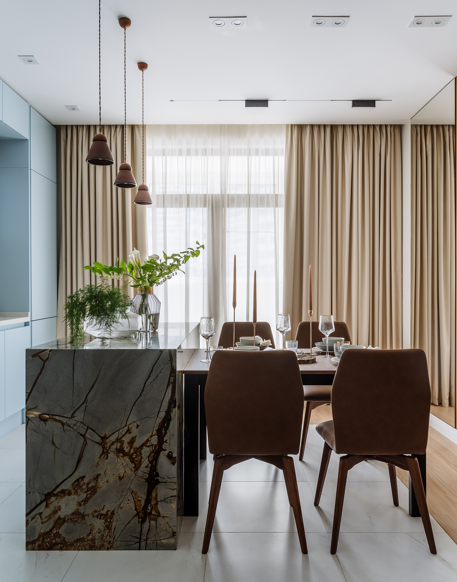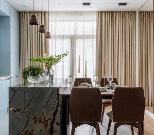 Кухня-гостиная 24 кв.м. остров из кварцита с встроенным винным холодильником