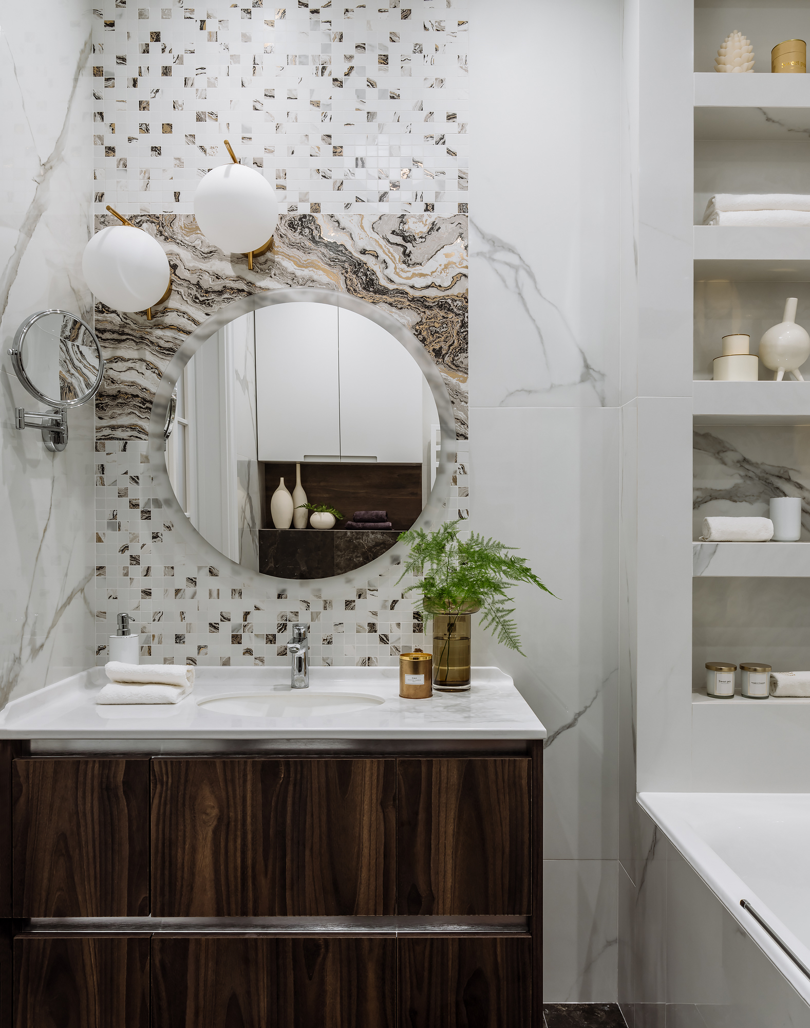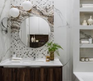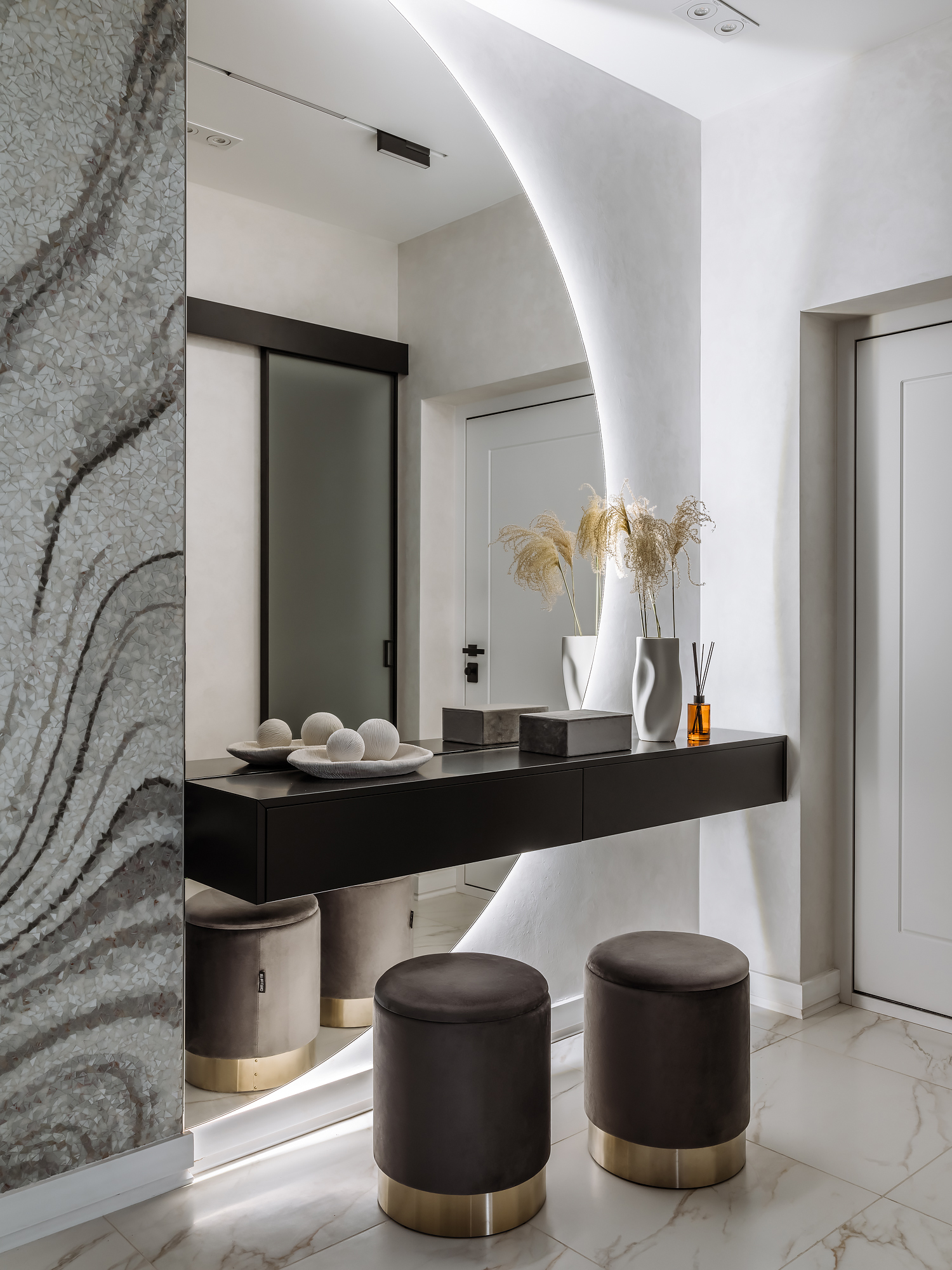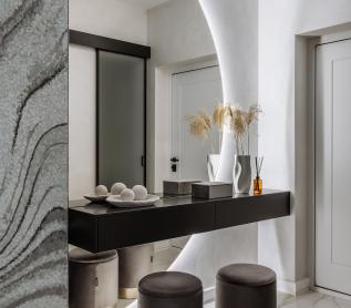 Мозаичное панно ручной работы, полукруглое зеркало с подсветкой и консоль выполнены на заказ.