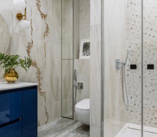 Мастер-санузел оформлен итальянской плиткой с двумя видами декора, перекликаясь между собой, они создают единую гармоничную картинку.