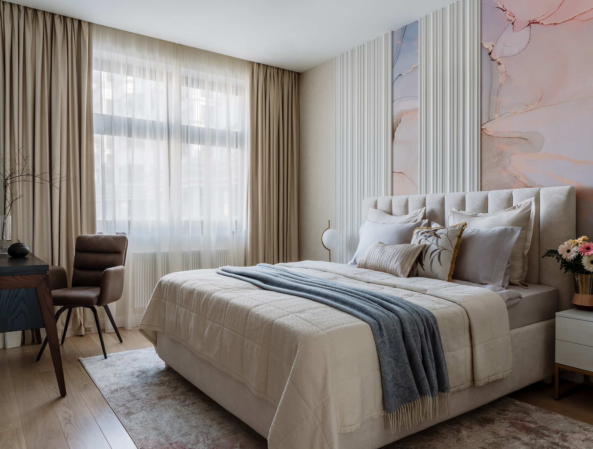 Мастер-спальня, украшенная фреской, выполненной на заказ и декоративными молдингами.