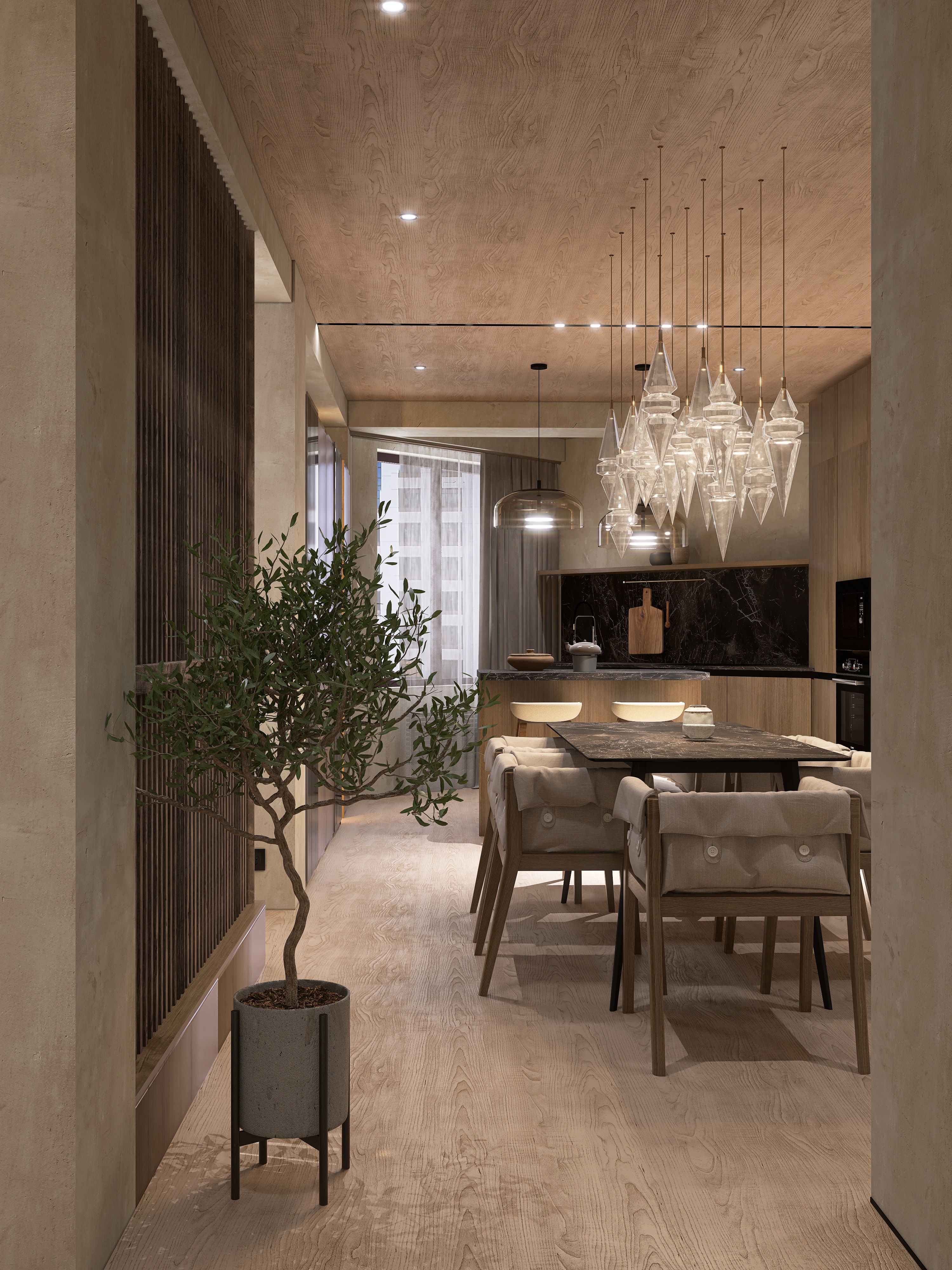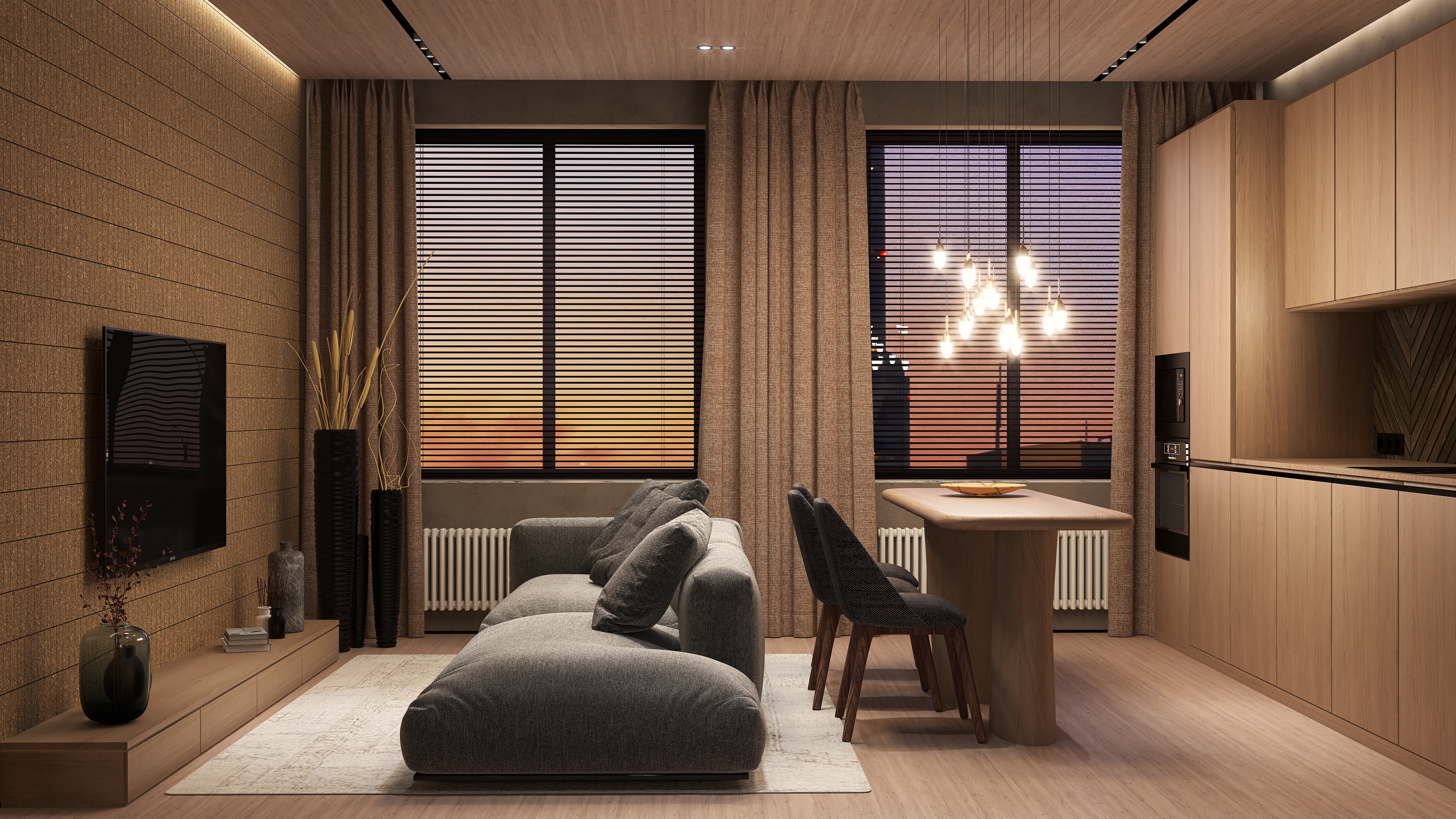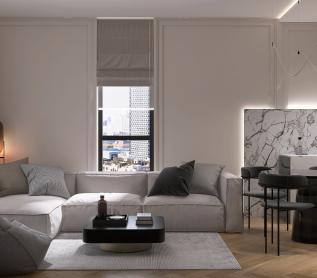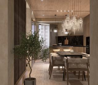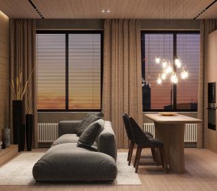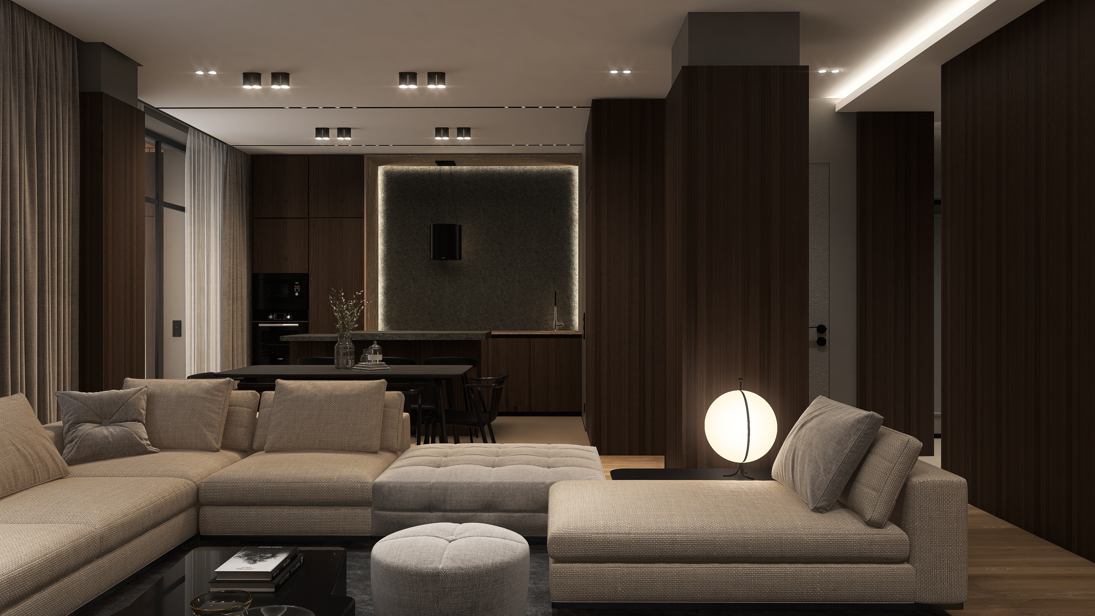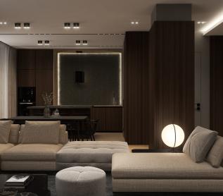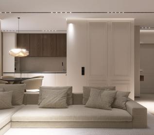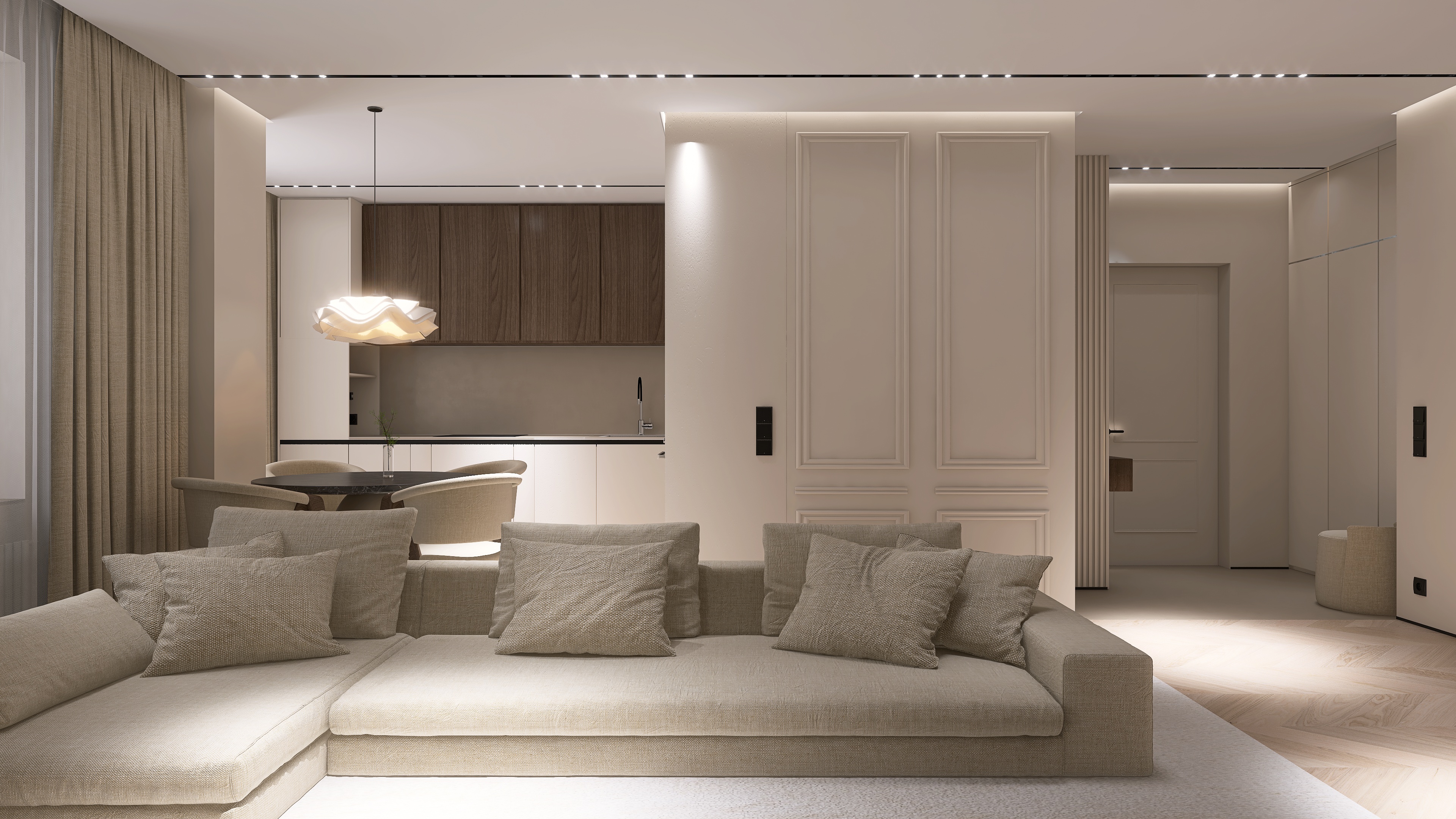 Образец продуманного contemporary дизайна. Доминирует теплая нейтральная палитра. Пространство дышит, каждый предмет на своем месте. Минимализм 2020-х - функциональный, но теплый.