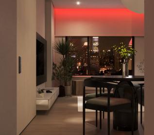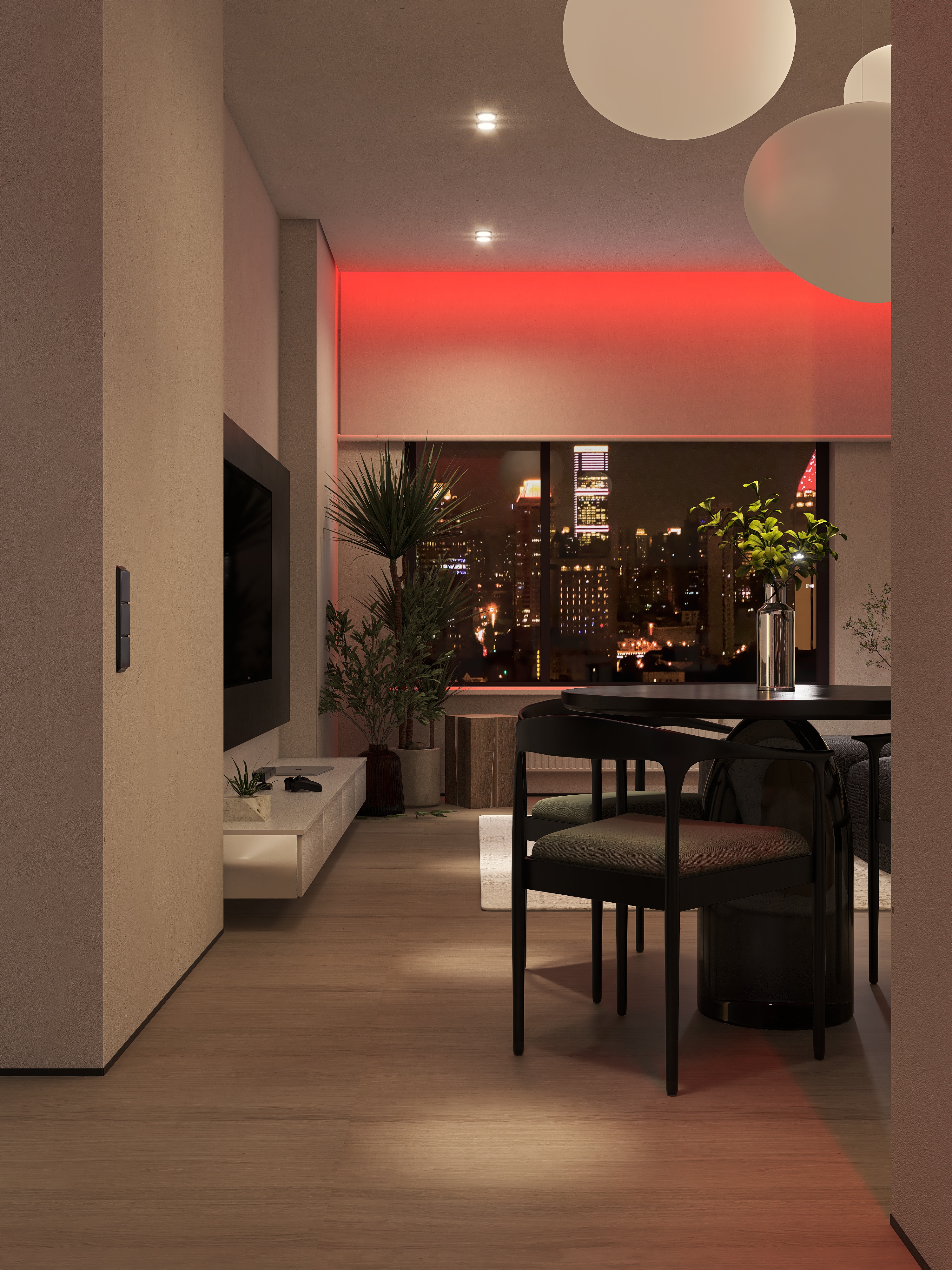 Минимализм Ваби‑Саби без показного блеска: матовые графитовые стены, мягкие «янтарные» контуры подсветки. Красота несовершенства и времени, асимметрия, простые формы, натуральные материалы, тактильность и полутон.