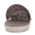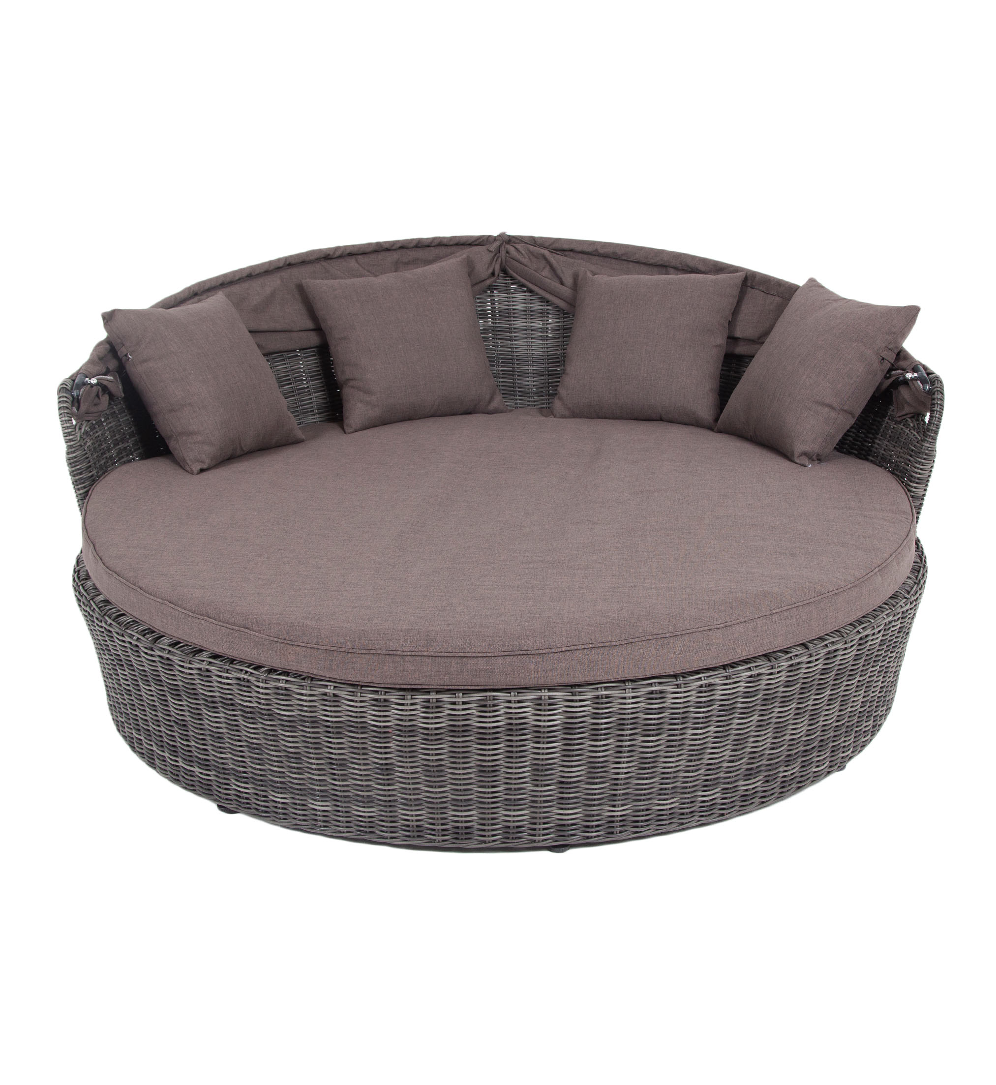 Диаметр кровати составляет 1850 мм, а высота 800 мм. Комплектацией предусмотрен набор из четырех серо-коричневых подушек - 450х450 мм и одного матраса - Ø1600 мм, высотой 60 мм.