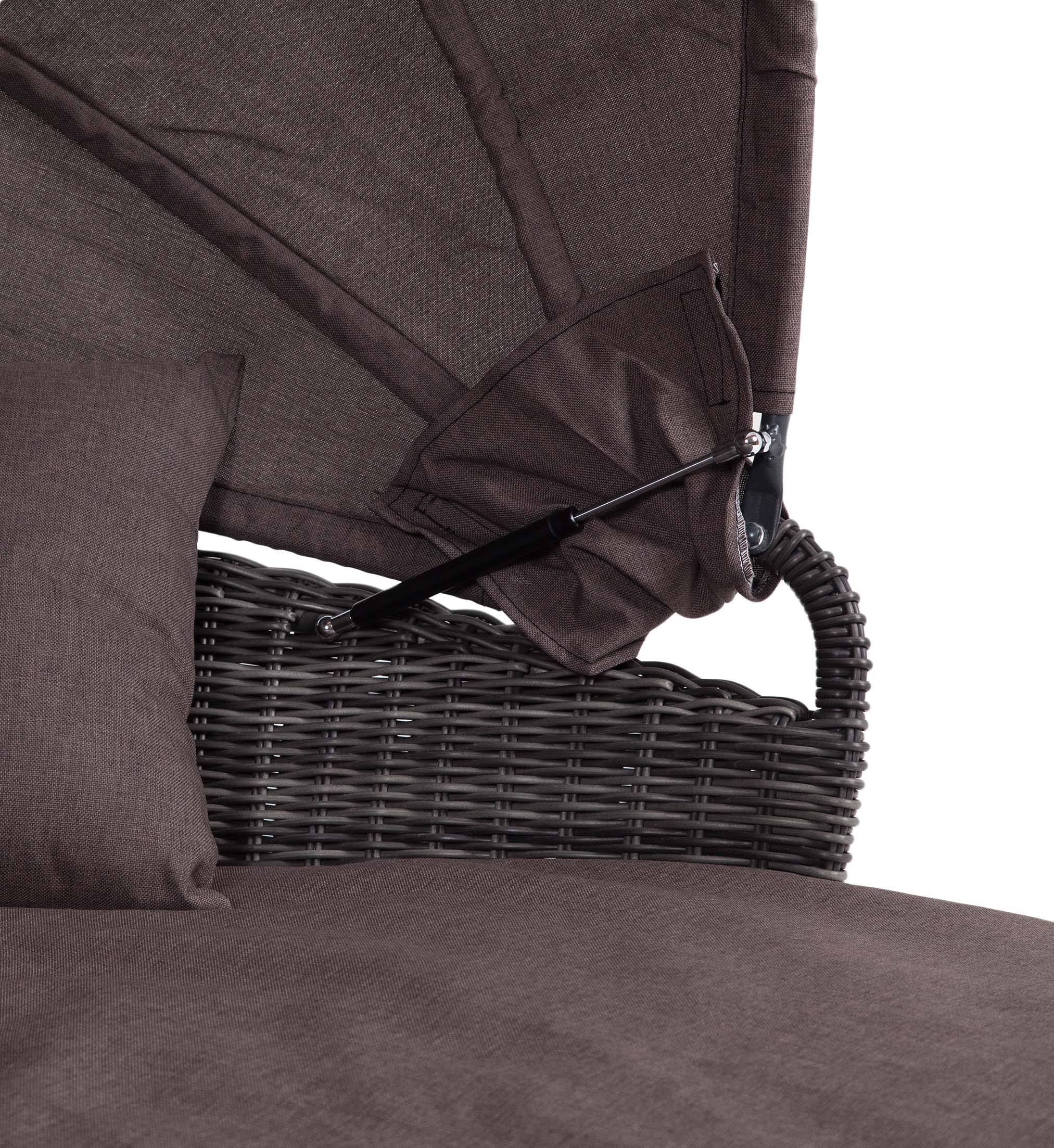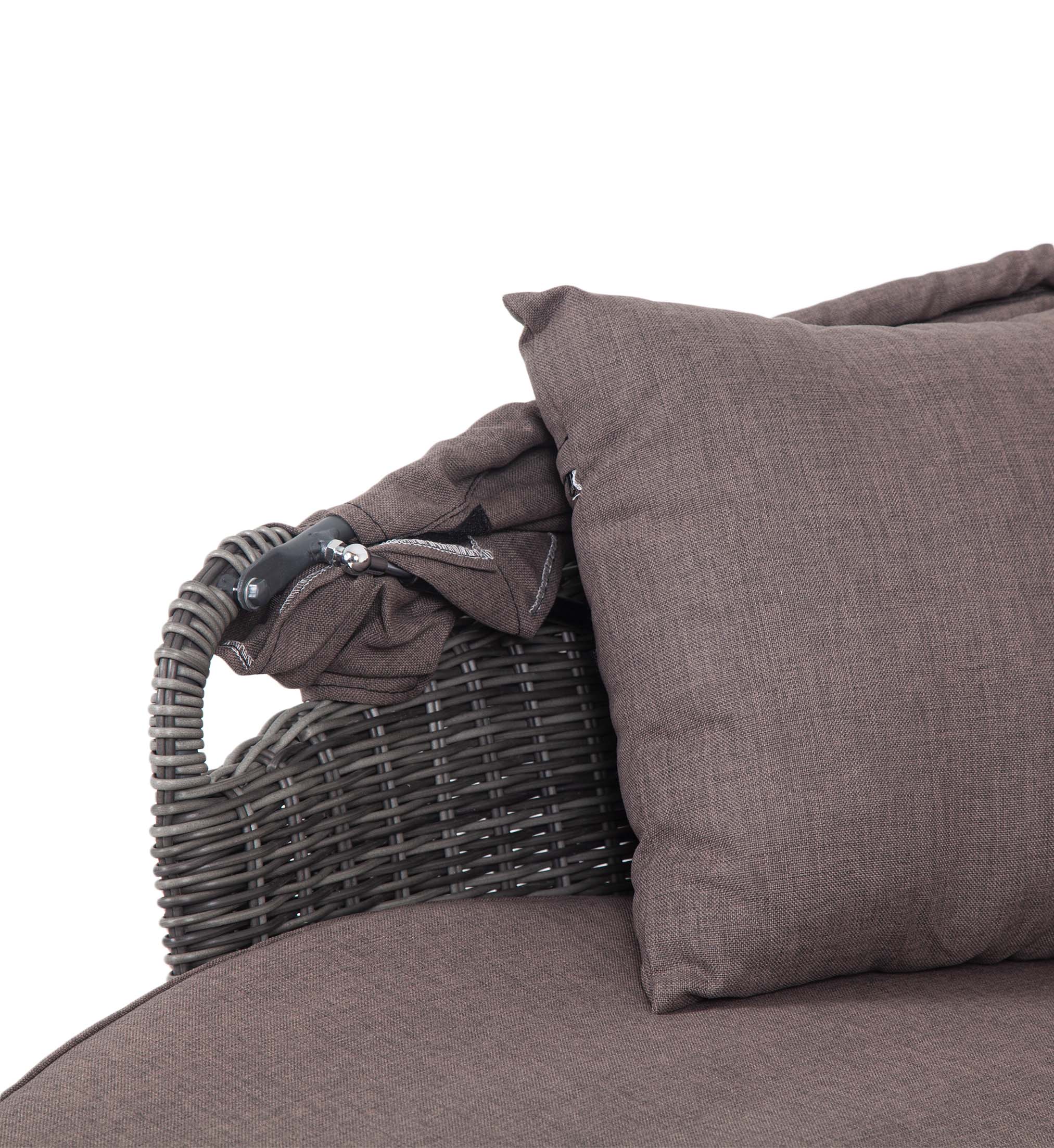Данная модель имеет в основании прочный алюминиевый каркас, оплетенный вручную круглым ротангом и оснащена регулируемым козырьком, который ограничивает попадание солнечных лучей. Выполнен из водостойкой полиэфирной ткани.