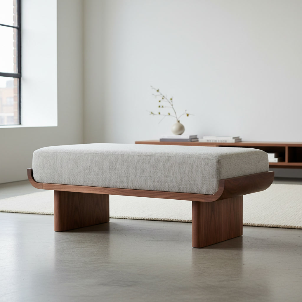 Полукруглое сиденье из микровелюра создаёт мягкий контраст к чёткой геометрии деревянных элементов и делает банкетку не только визуально интересной, но и удобной для повседневного использования.