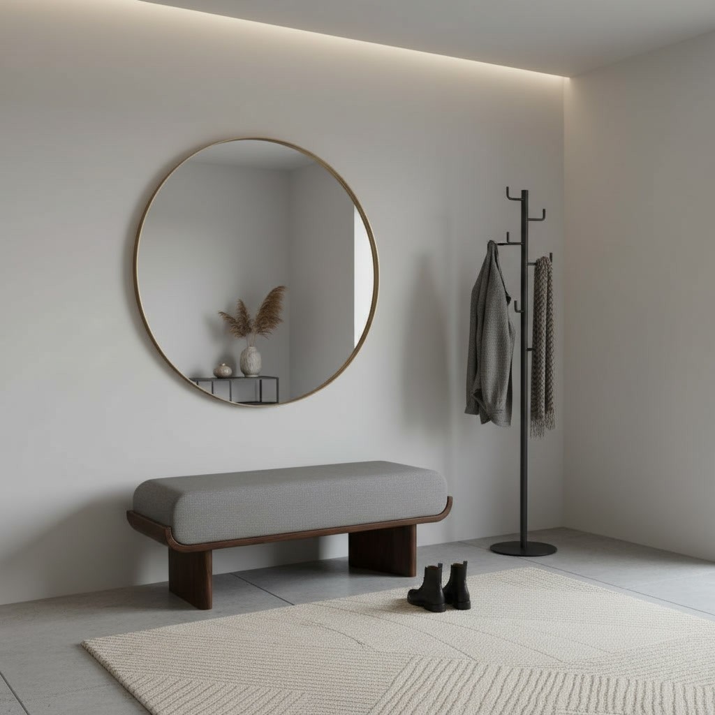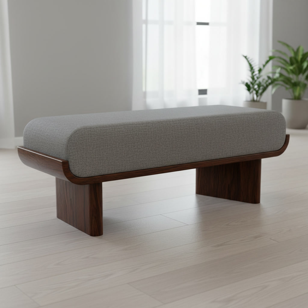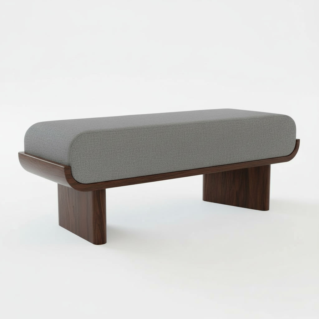 Полукруглое сиденье из микровелюра создаёт мягкий контраст к чёткой геометрии деревянных элементов и делает банкетку не только визуально интересной, но и удобной для повседневного использования.