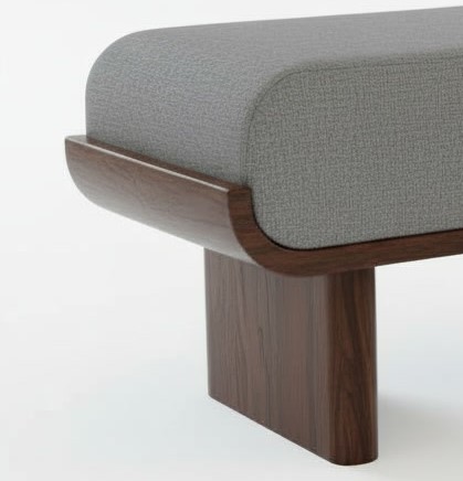 Основание из шпонированной фанеры, отделанной американским орехом, подчёркивает насыщенный цвет и выразительную текстуру древесины. Радиусные края основания формируют ощущение защиты и поддержки мягкой части.