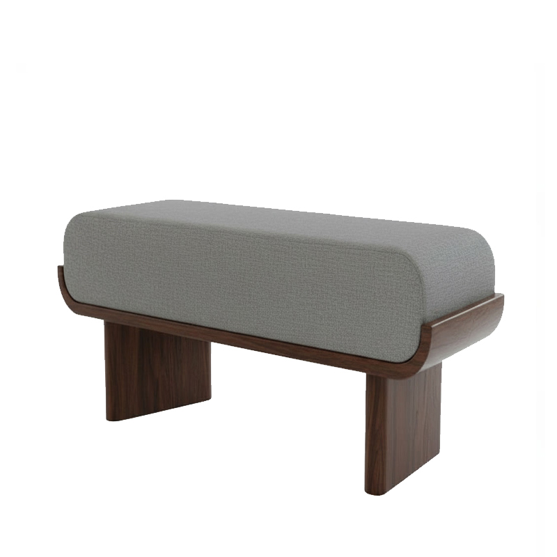Полукруглое сиденье из микровелюра создаёт мягкий контраст к чёткой геометрии деревянных элементов и делает банкетку не только визуально интересной, но и удобной для повседневного использования.