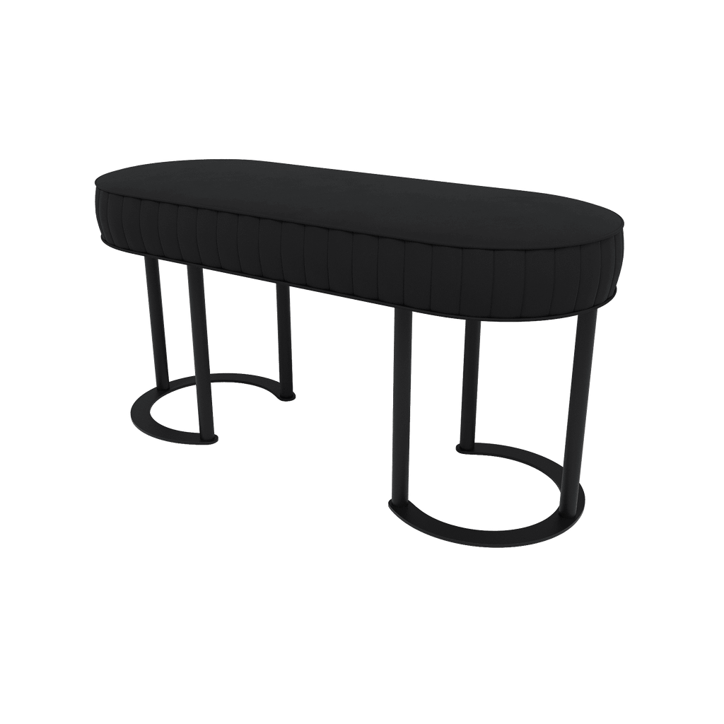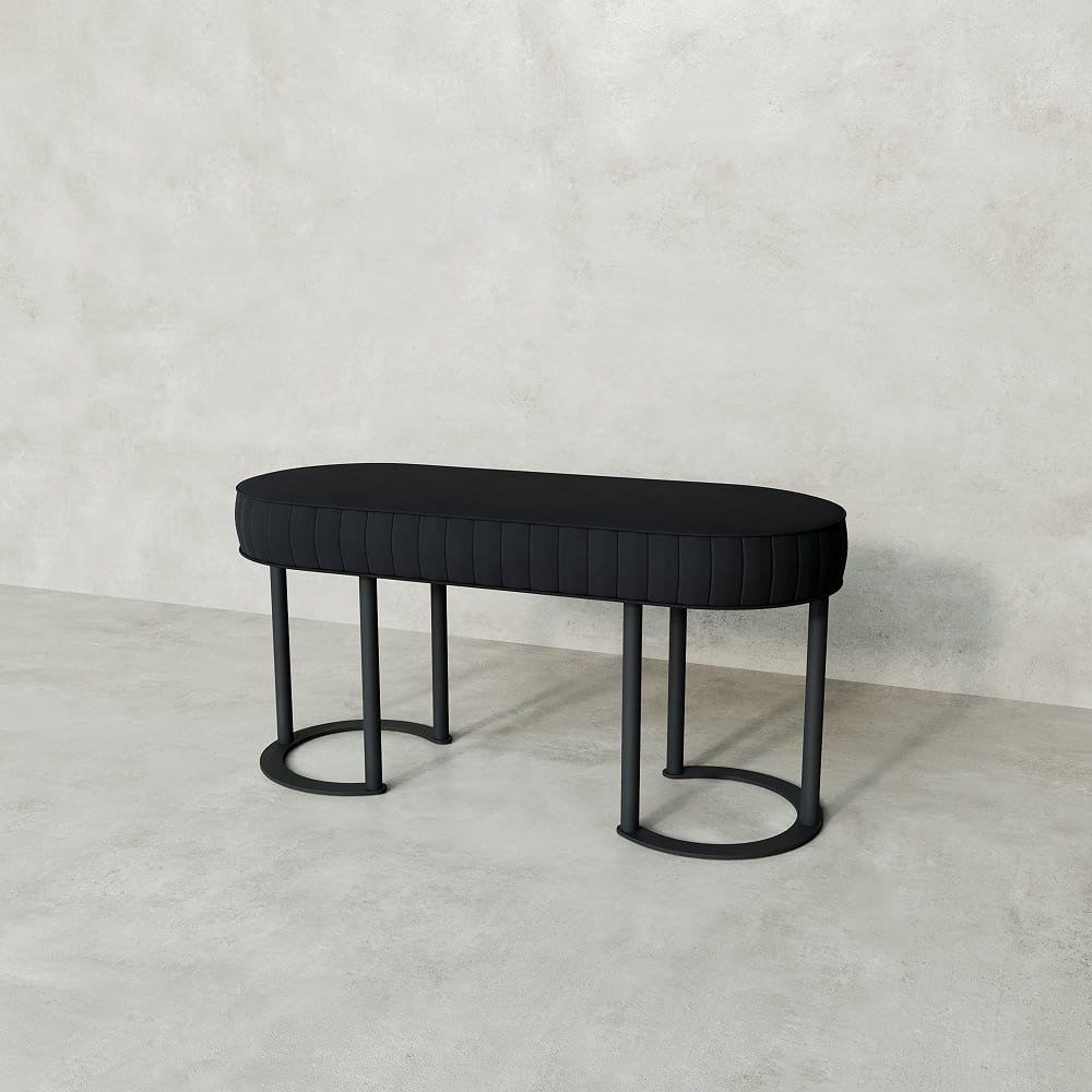 Овальная форма банкетки DUHORSIX и изящный металлический каркас воплощают современный стиль, гармонично вписываясь в различные интерьерные решения.