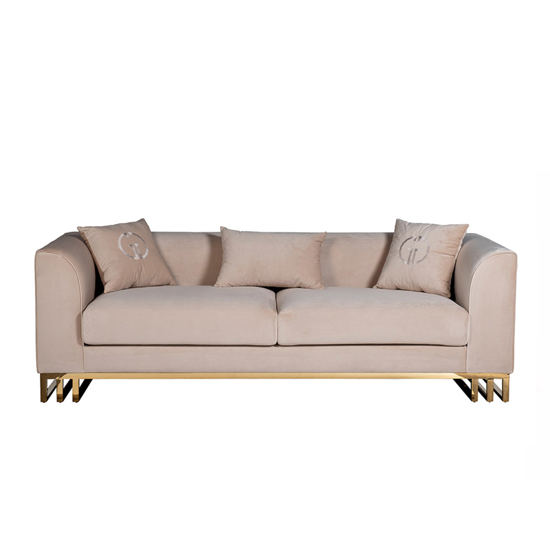 Запросить индивидуальное предложениеДиван Lucerne отличается силуэтом с прямыми углами, но при этом не выглядит громоздко за счет того, что нижняя часть приподнята на основании из металлического профиля. Внешняя часть декорирована прострочкой по приятному бежевому велюру, основание выполнено из нерж.стали с глянцевым золотым покрытием. В комплект входят две декоративные подушки 47*47см с фирменной вышивкой и одна подушка 40*60см без вышивки.Сочетается с креслом Lucerne 102AN-20491