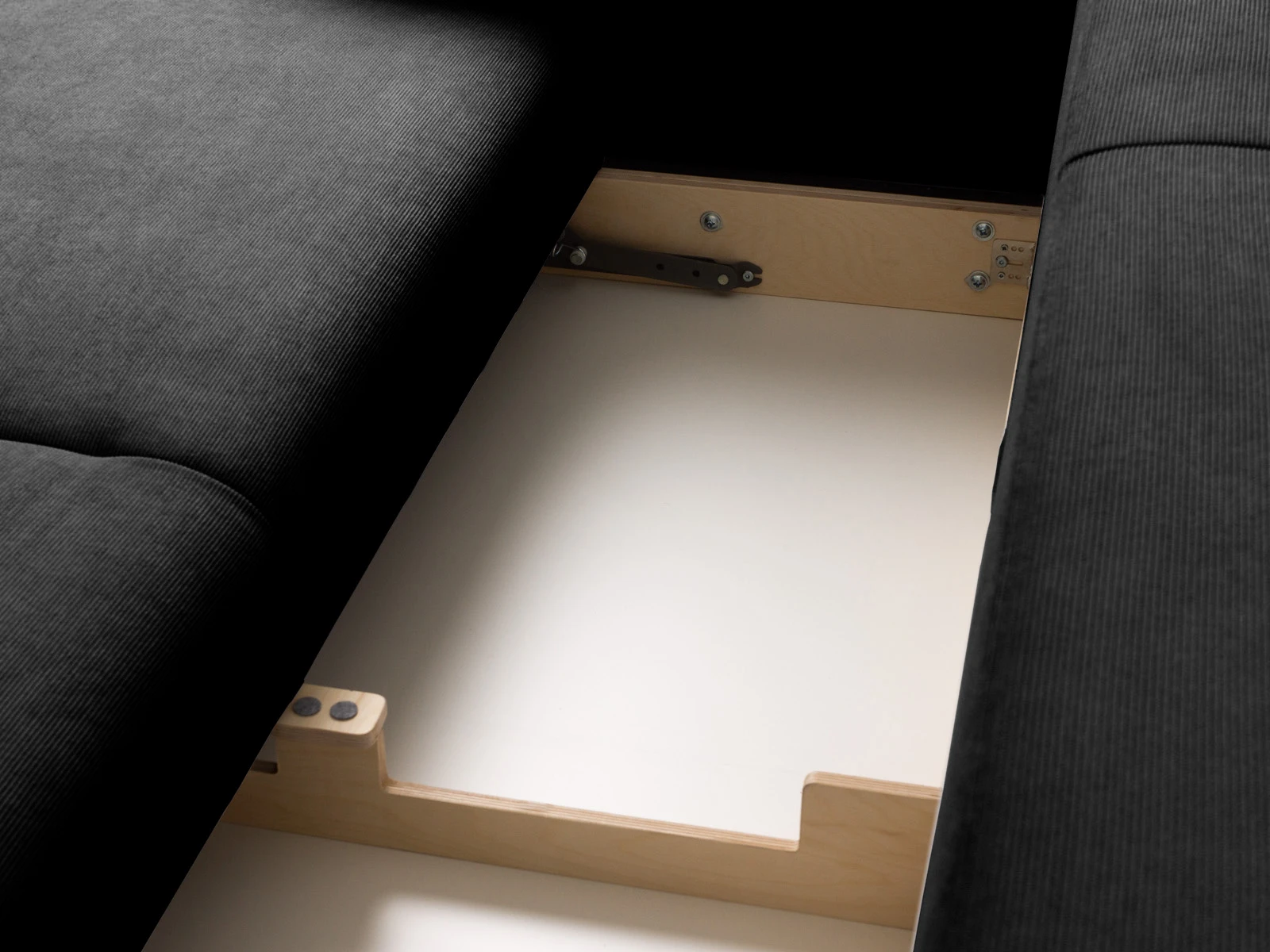 Диван Menfi превращается в кровать с помощью выдвижного механизма «еврокнижка» — прост и надежен в эксплуатации. Чтобы трансформировать диван нужно вытянуть секцию сиденья вперед, а на освободившееся место положить спинку дивана. Под сиденьем есть ниша, в которой можно хранить белье, текстиль, различные вещи.