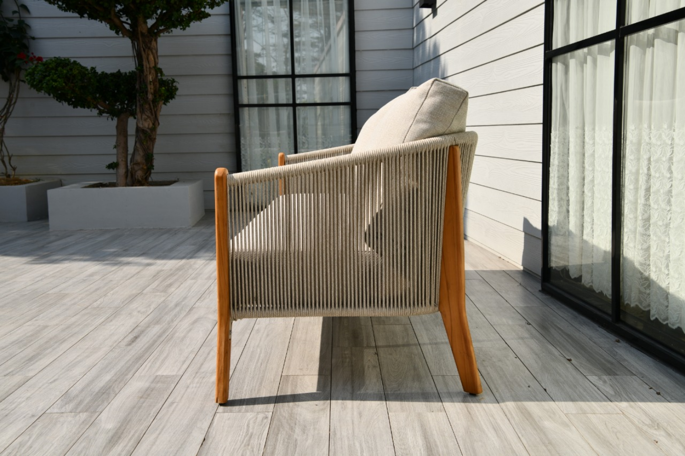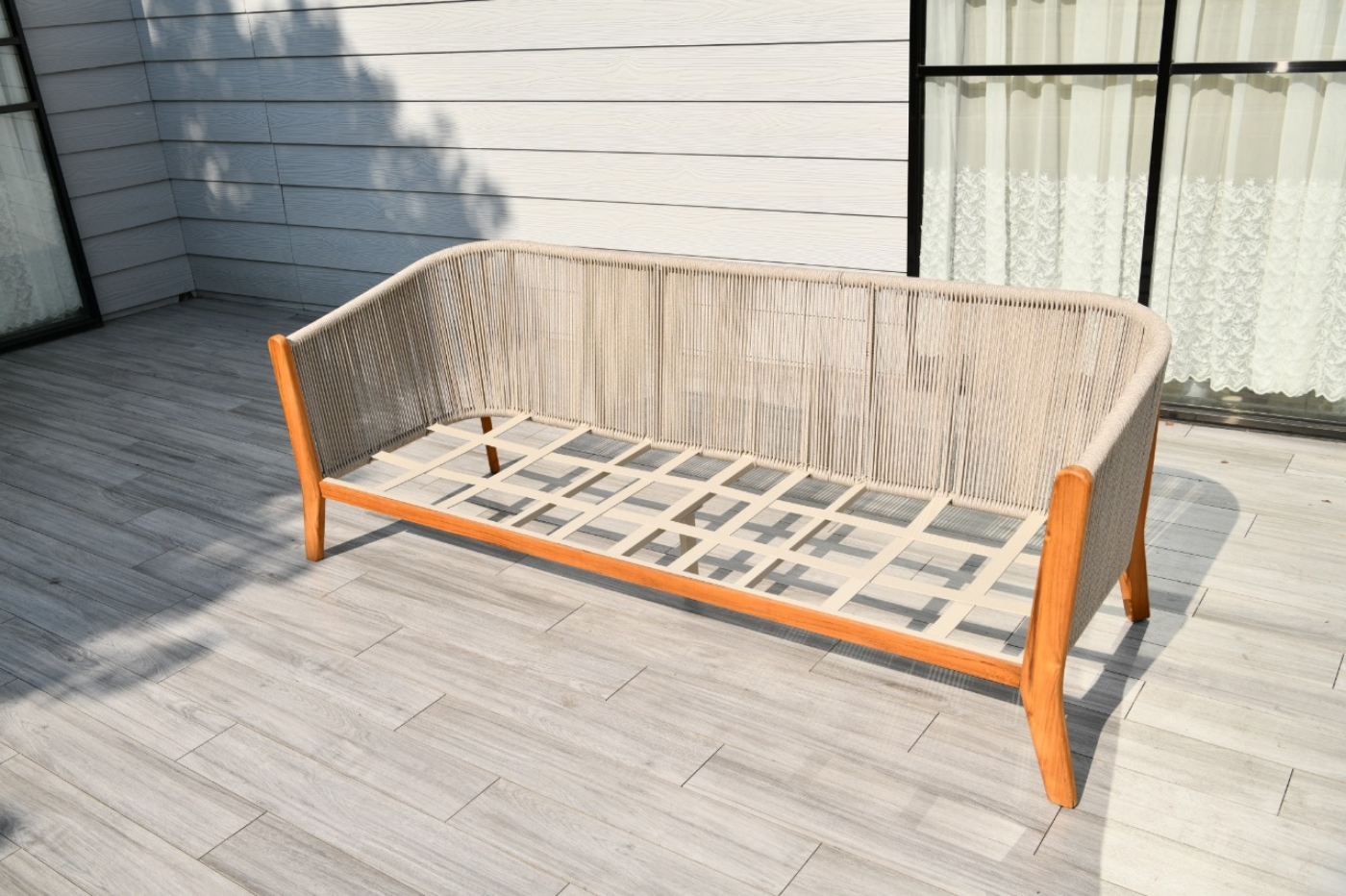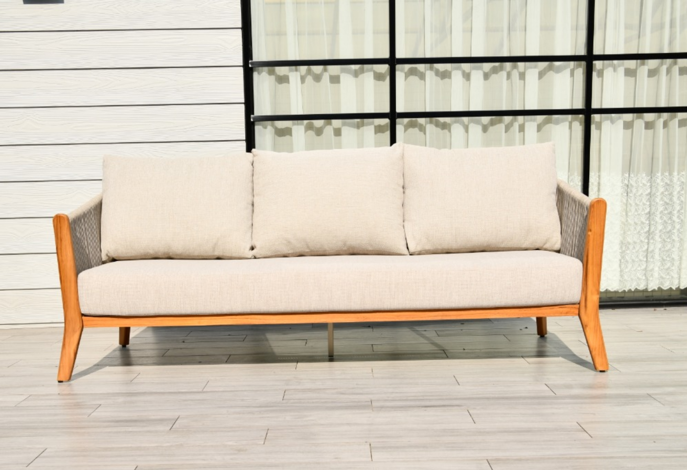 "Сидней" диван 3-местный плетеный из роупа, основание тик, каркас алюминий бежевый, роуп бежевый, ткань бежевая