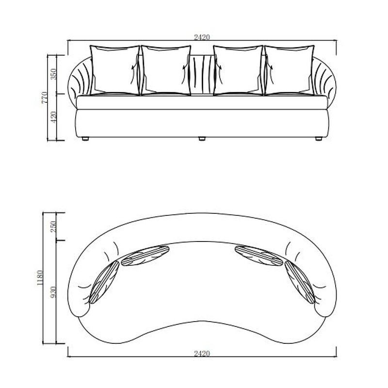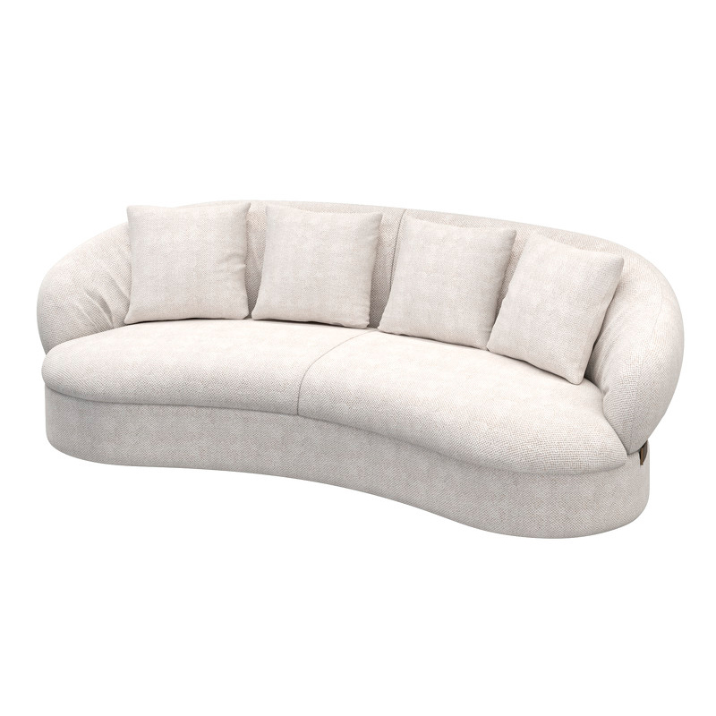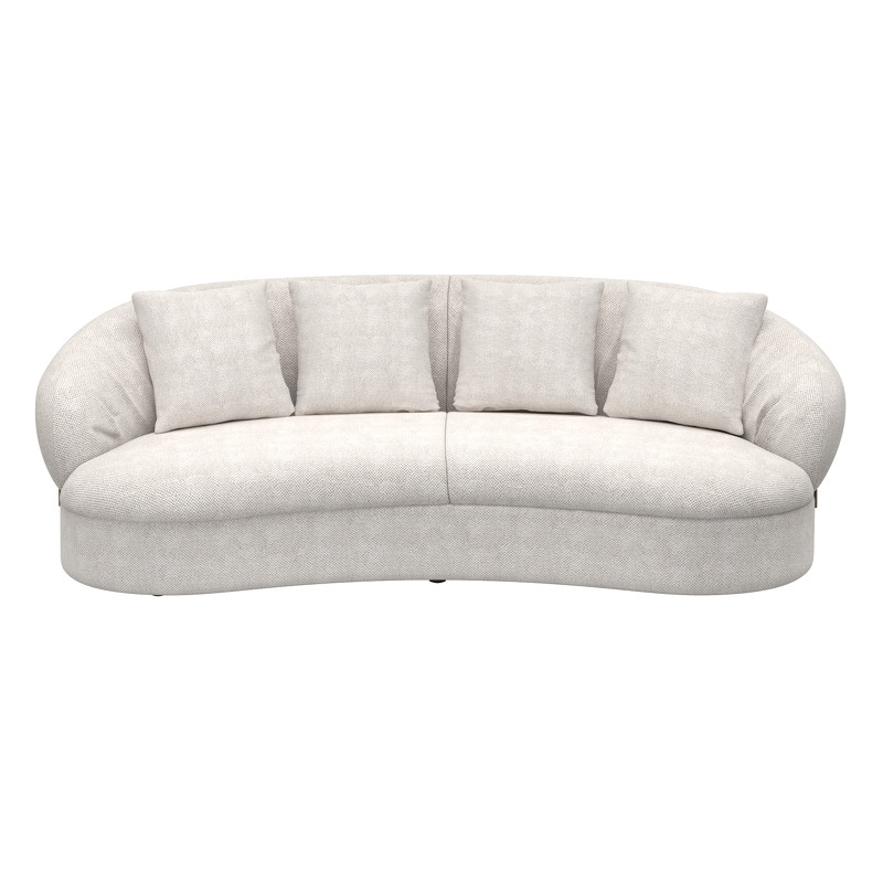 Диван выполнен в отделке тканью из ассортимента фабрики, декоративная металлическая вставка в цвете матовая латунь. Наполнитель дивана пенополиуретан. В комплекте идут четыре декоративные подушки в цвет дивана.