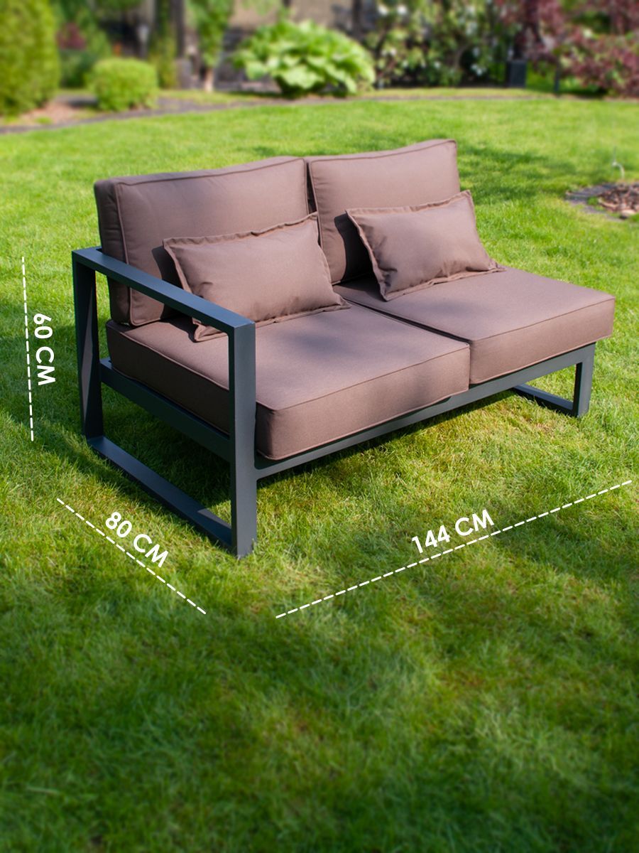 Запросить индивидуальное предложениеДиван «Лагуна» 2-х местный (с правым подлокотником). Каркас: Алюминий, окрашенный в цвет антрацит. Размеры дивана ШхВхГ 1380х600х800 мм. Размеры подушек: для сиденья ШхВхГ 800х120х660 мм; Вес: 3 кг. Подушка под спину 660х390 мм. Вес: 1,8 кг.