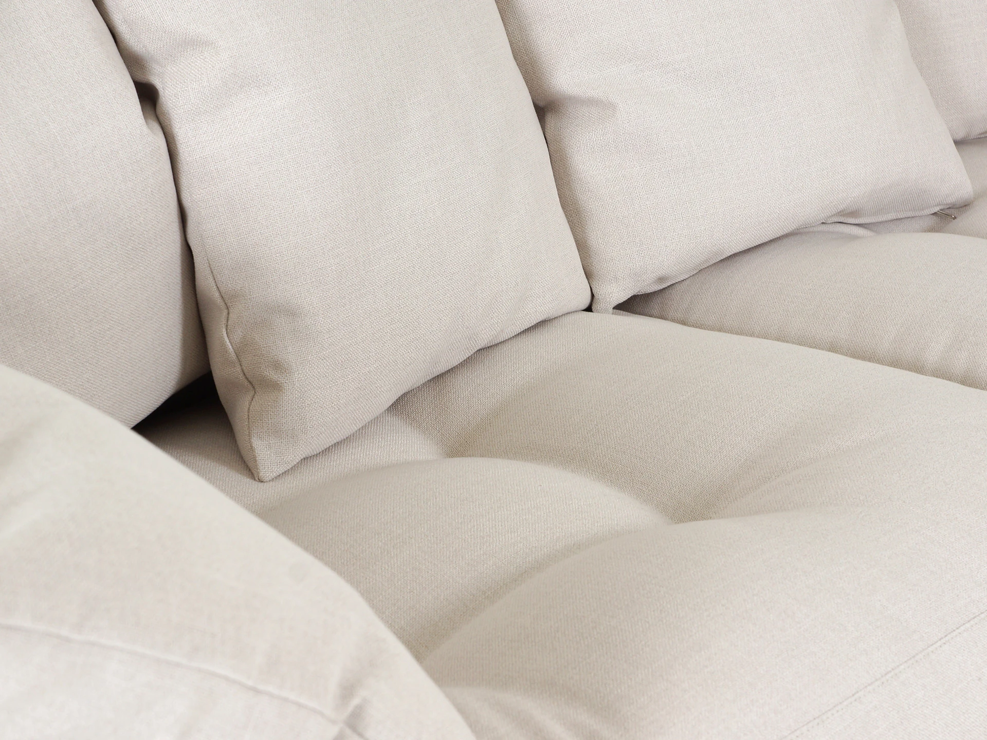 Сидение дивана мягкое, состоит из 2х подушек сидения, с дополнительным верхним слоем пуха-пера. На подушках сидения выполнена декоративная утяжка.