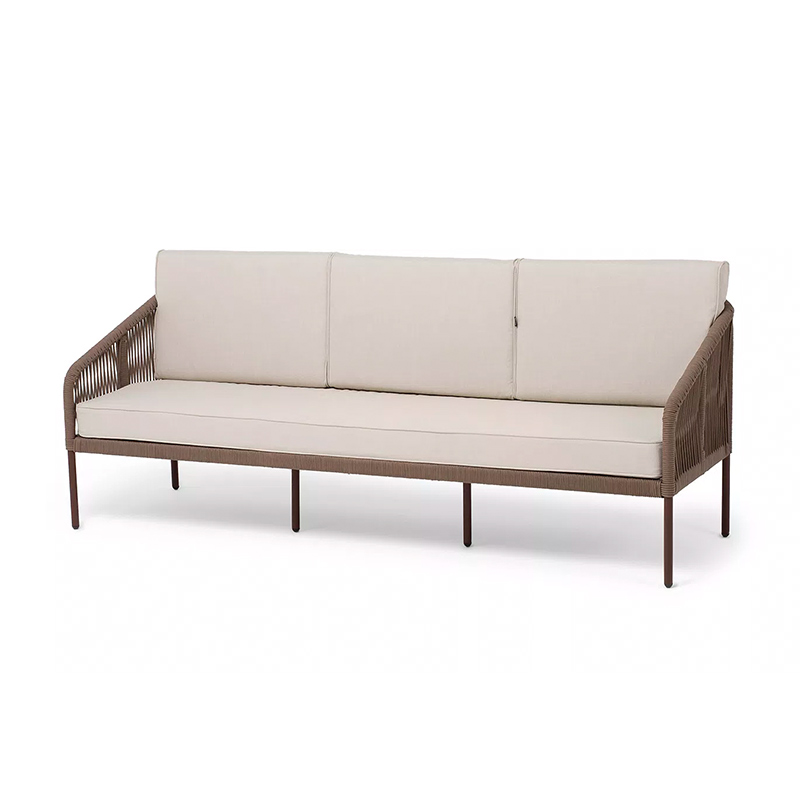 "Канны" диван 3-местный плетеный из роупа, каркас алюминий коричневый (RAL8016) муар, роуп коричневый круглый, ткань бежевая 035