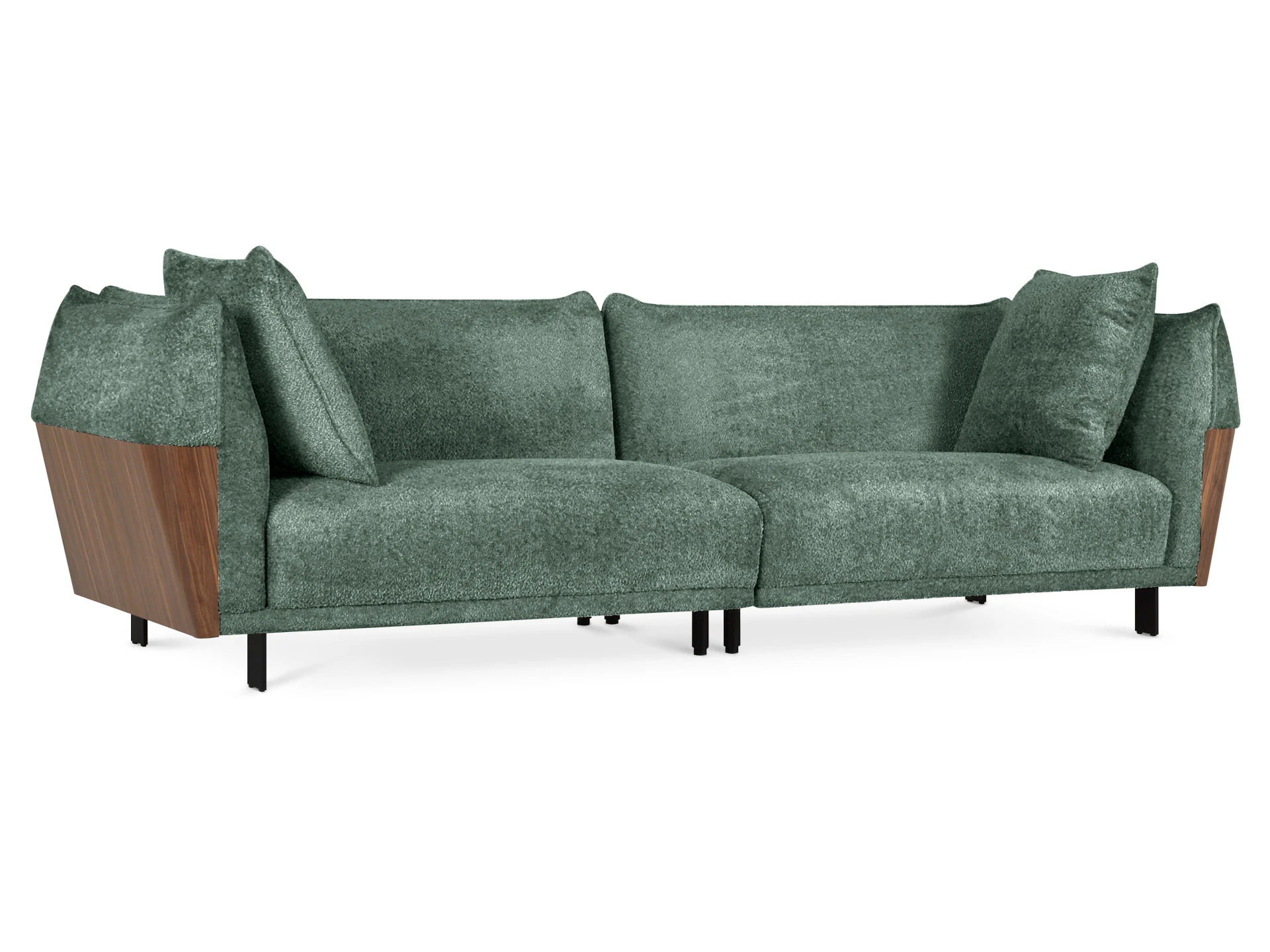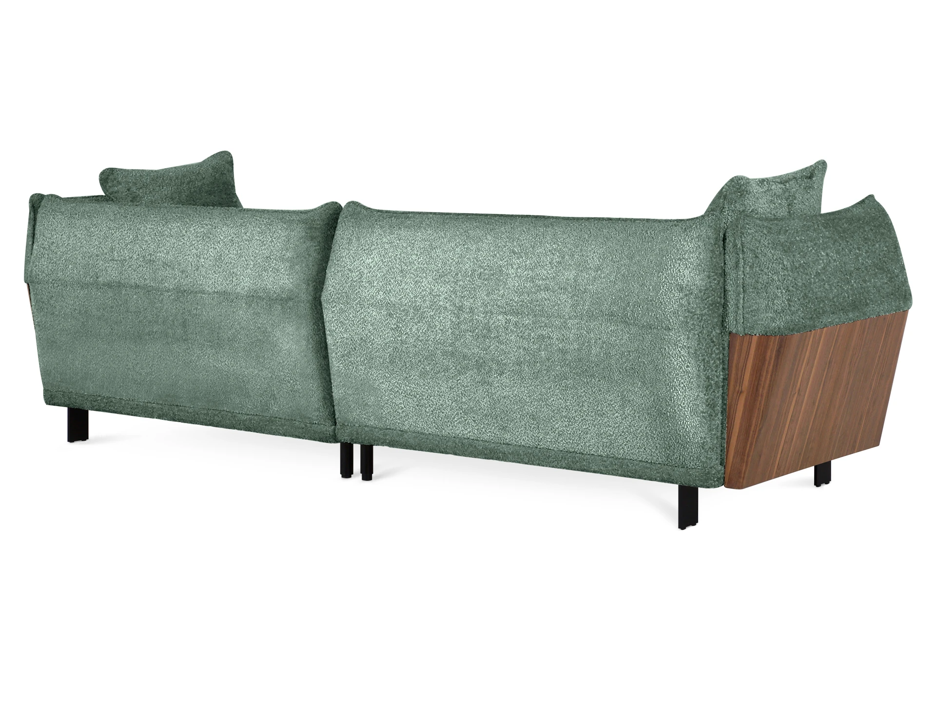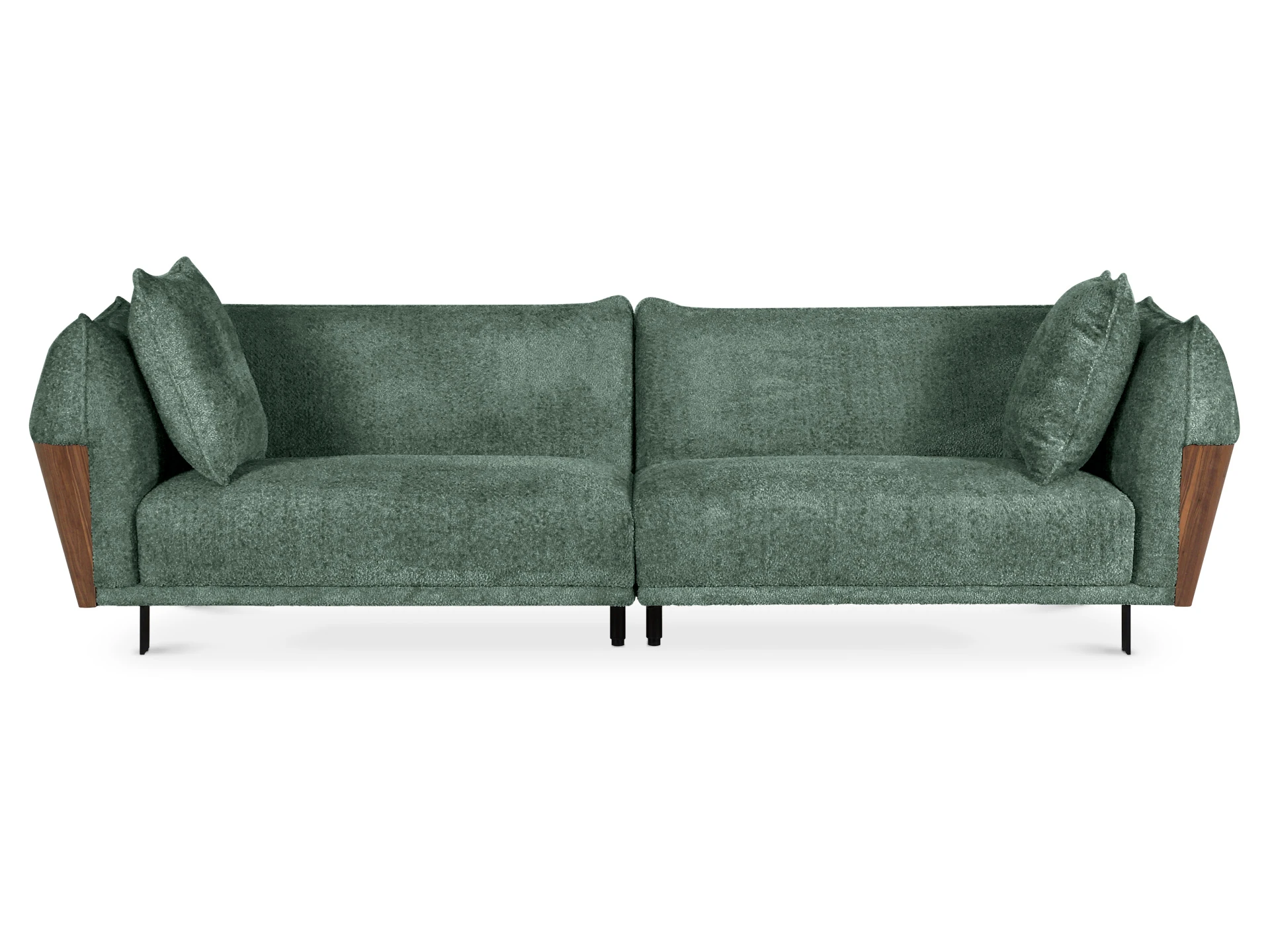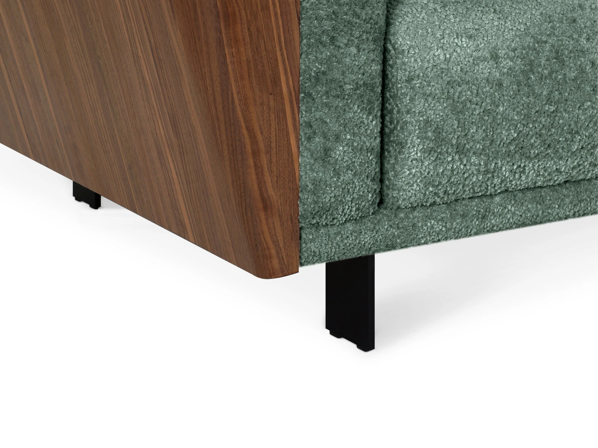 В основании дивана – четыре металлические Т-образные опоры матового черного цвета по углам, и четыре цилиндрические регулируемые опоры по центру. На торцы опор установлены пластиковые подпятники.