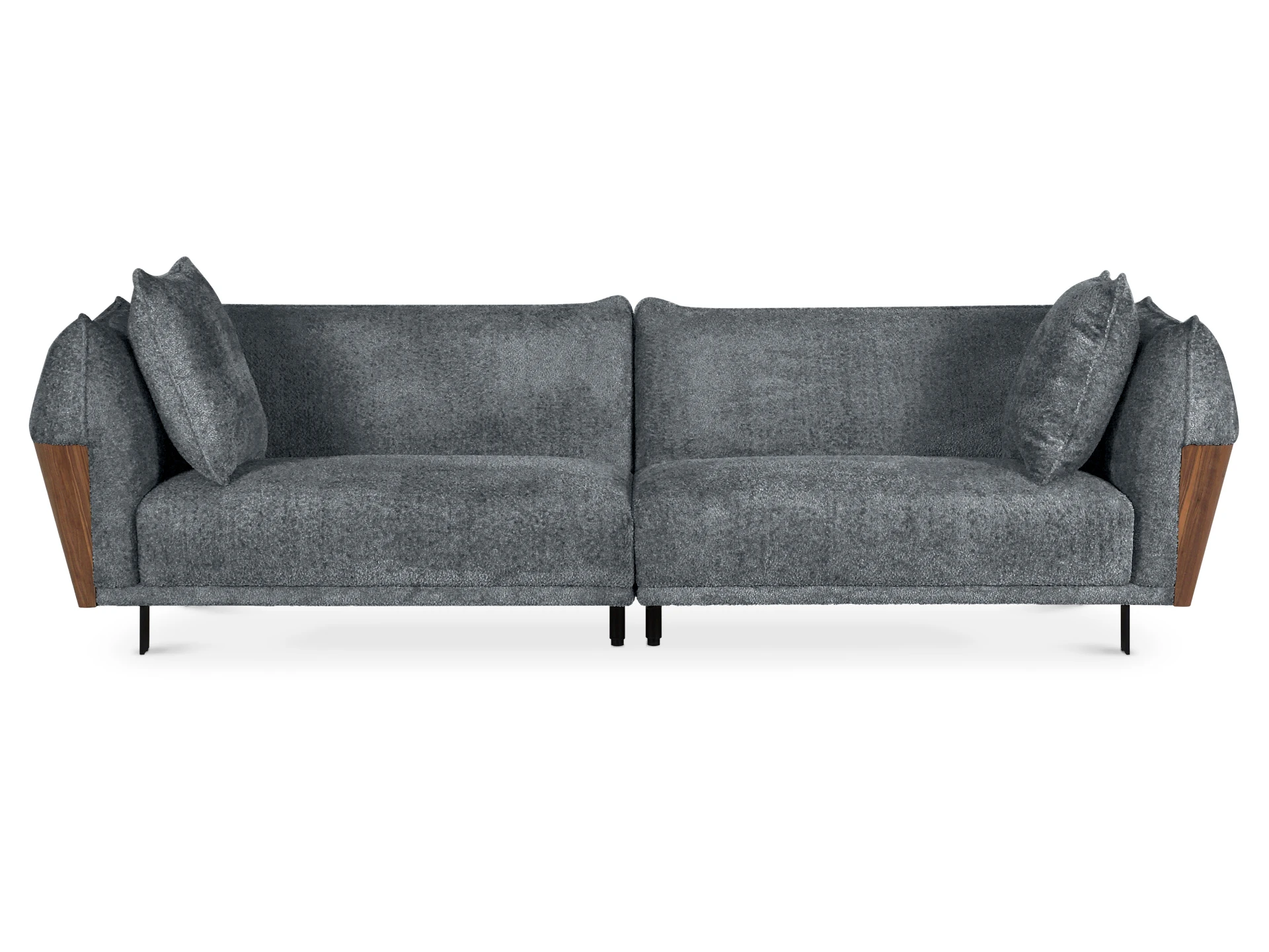 В основании дивана – четыре металлические Т-образные опоры матового черного цвета по углам, и четыре цилиндрические регулируемые опоры по центру. На торцы опор установлены пластиковые подпятники.