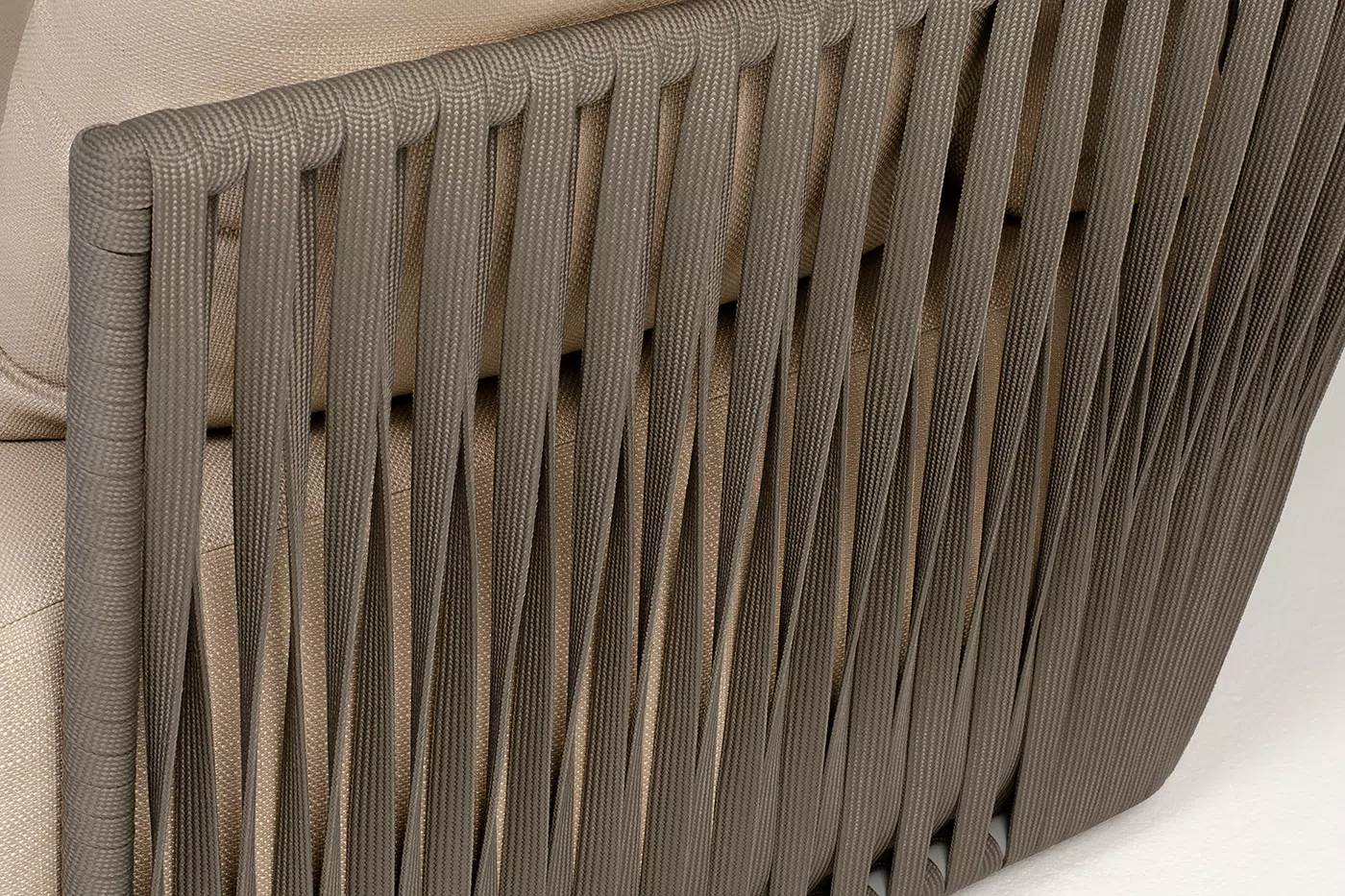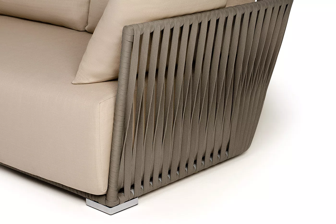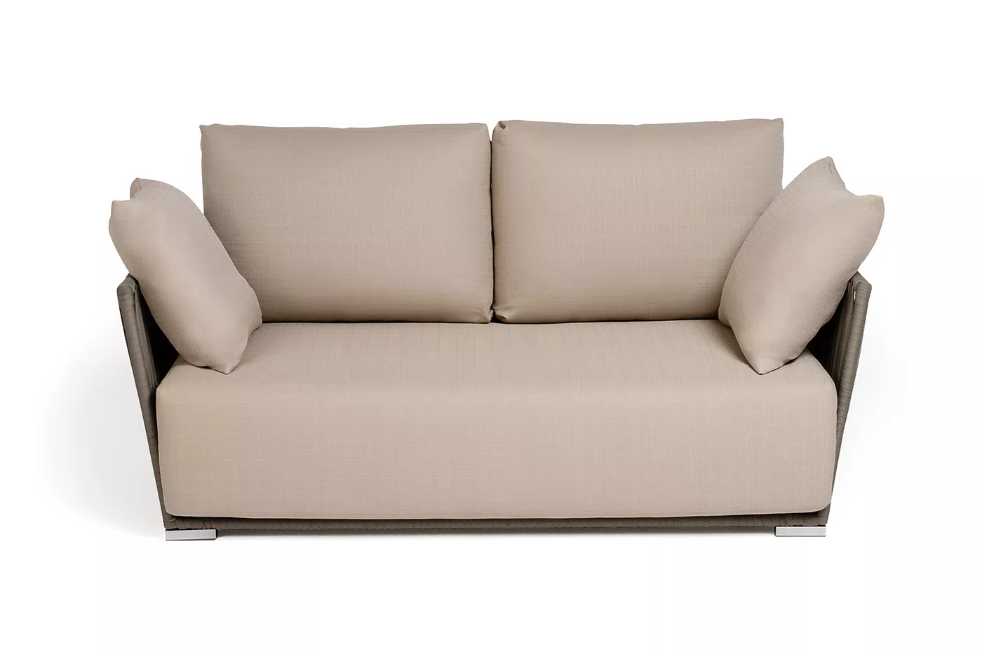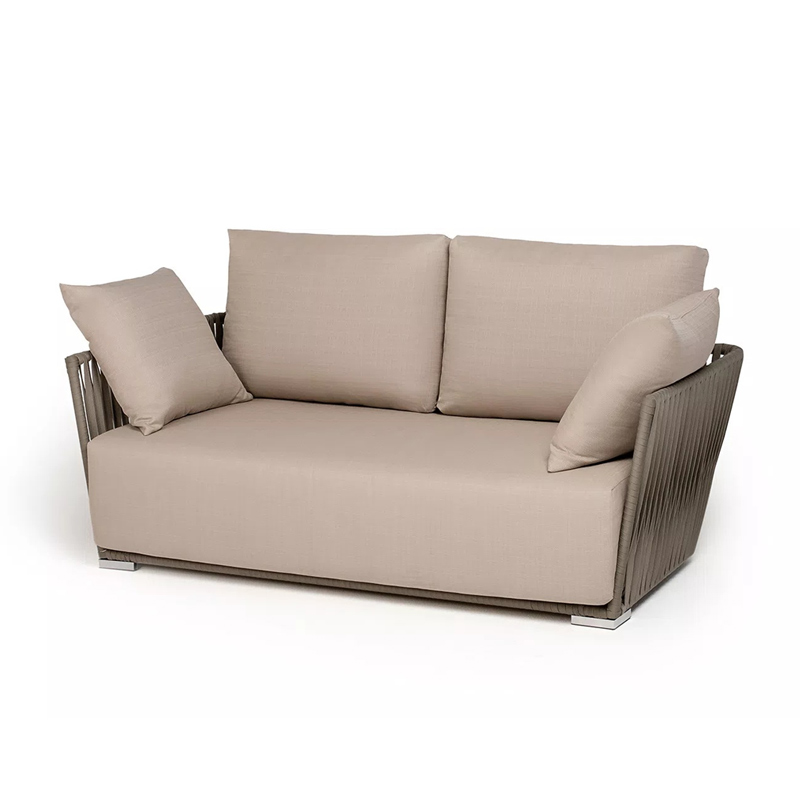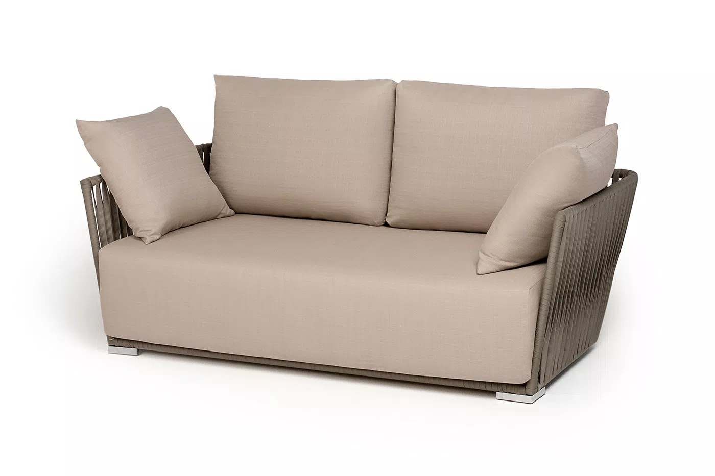 "Форли" диван 2-местный плетеный из роупа, каркас алюминий светло-серый (RAL7035) муар, роуп серо-коричневый 23мм, ткань Mossle бежевая
