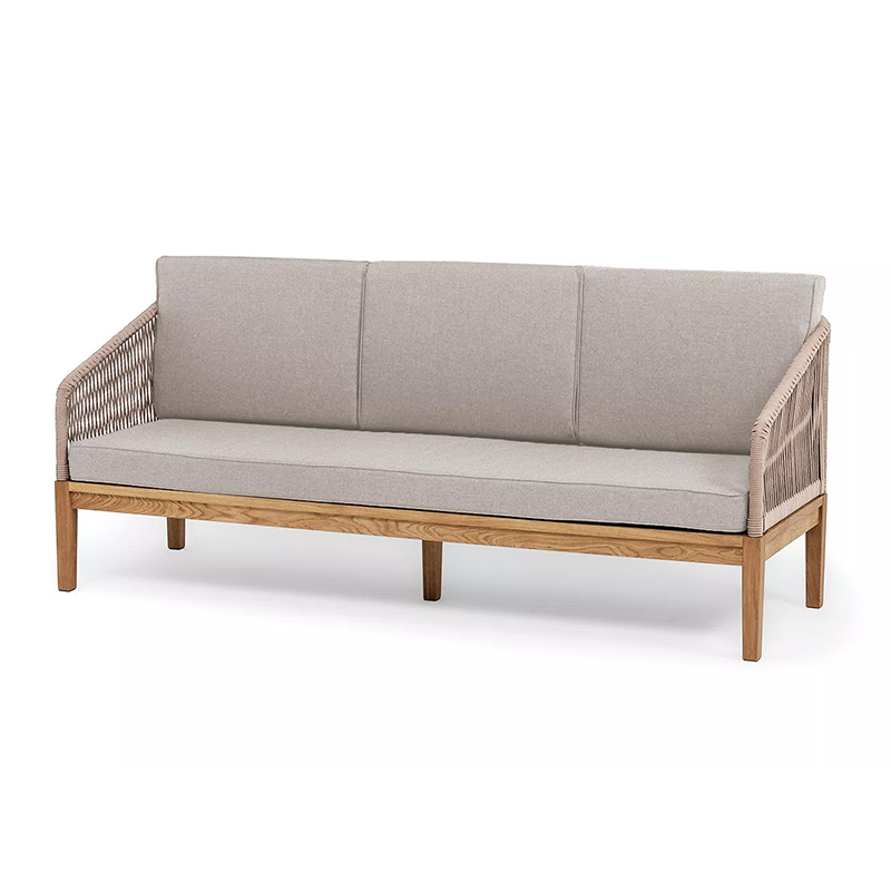 "Канны" диван 3-местный плетеный из роупа, основание дуб, роуп бежевый круглый, ткань бежевая 15052