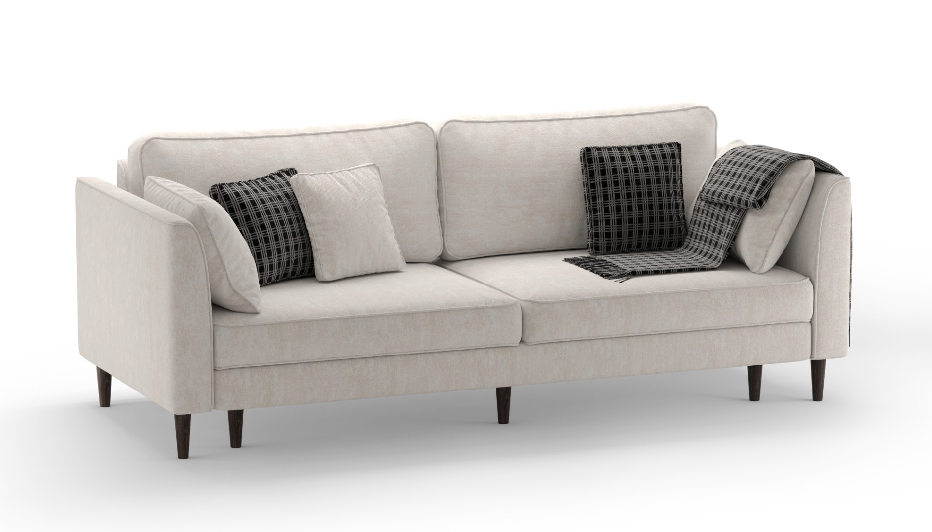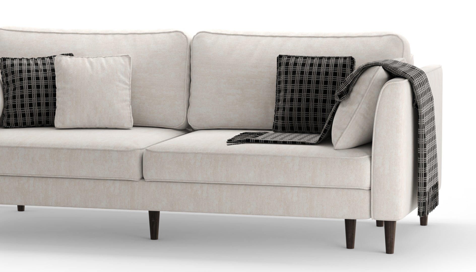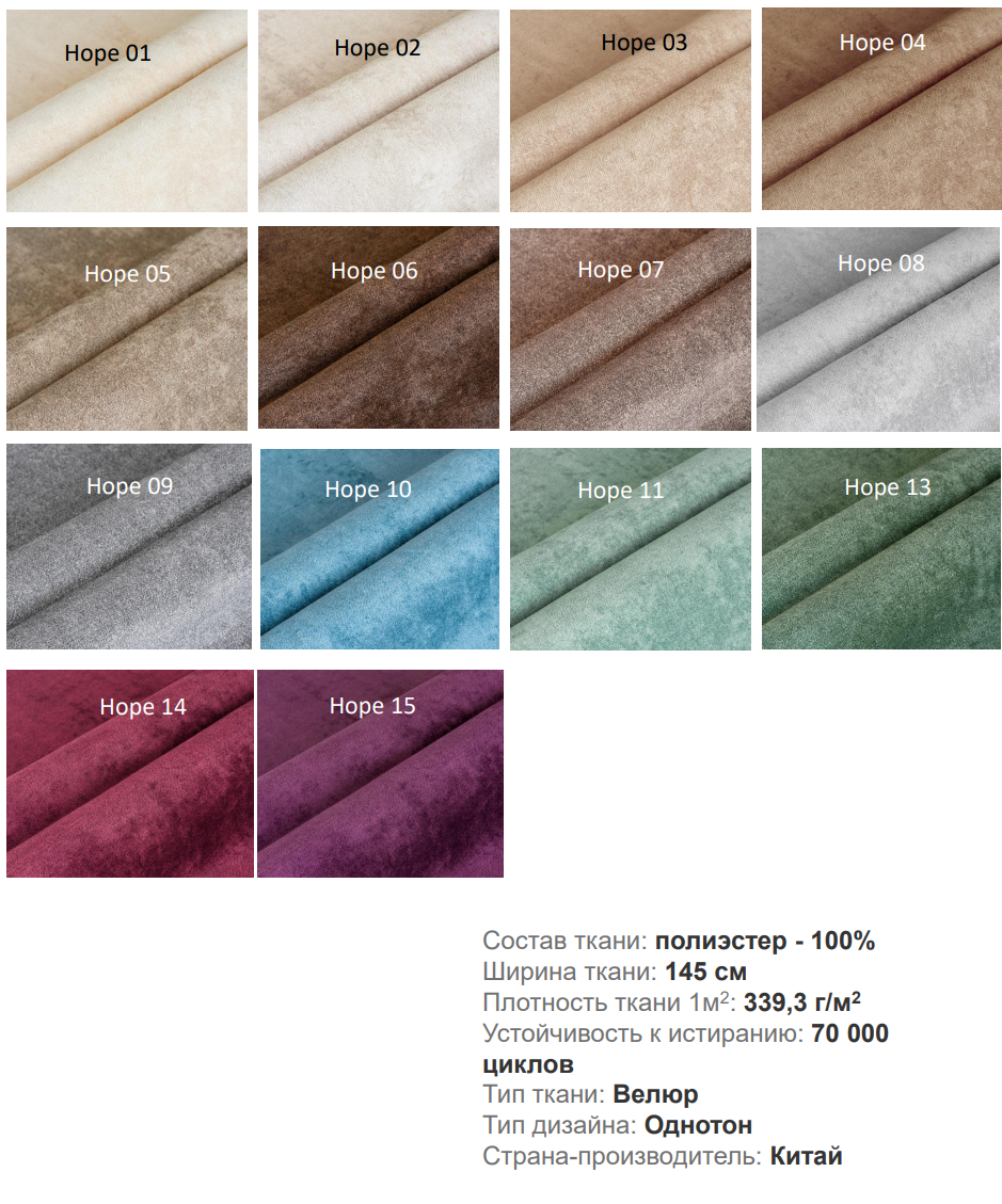 Диван исполнен в ткани велюр «Hope», которая имеет хорошую плотность и легко моется, износоустойчивость более 70000 циклов по Мартиндейлу.
