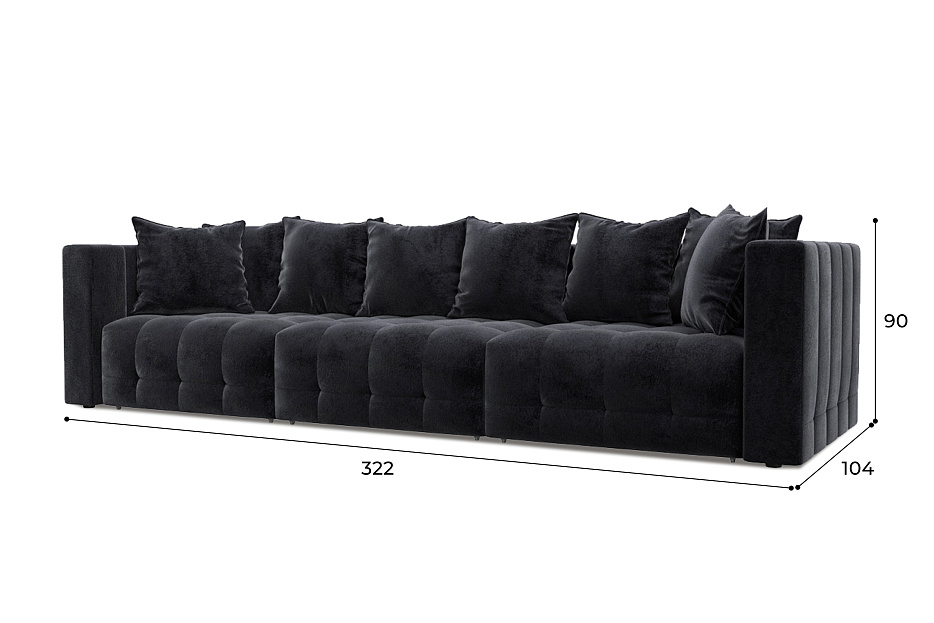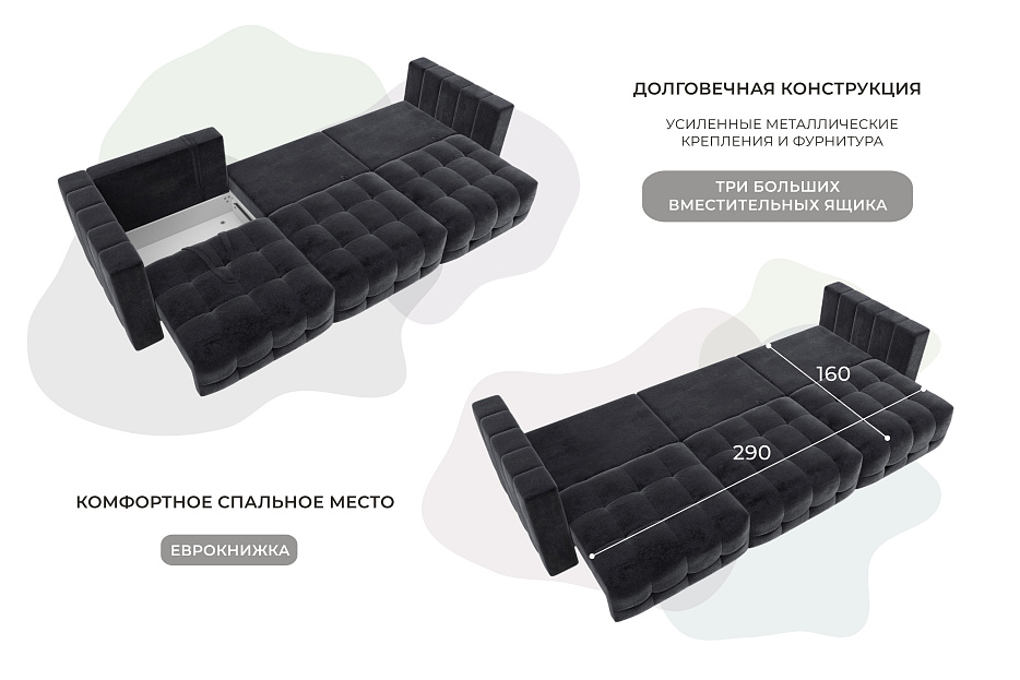 При габаритах: 322х90х104 см подойдет для просторных комнат для большой семьи или вечеров в компании, легко раскладывается, обеспечивая спальное место 160x290 см.