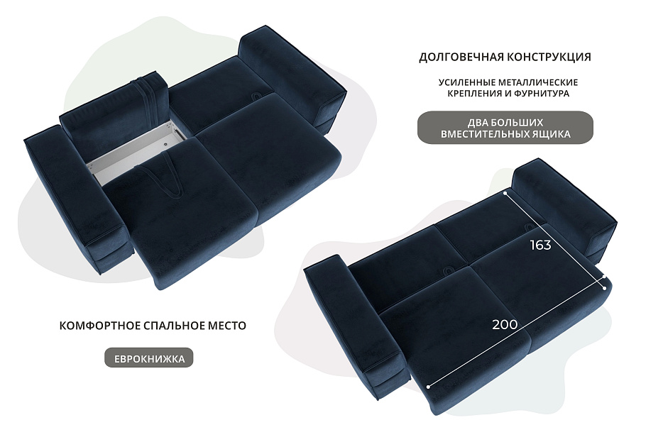 При габаритах: 270х80х114 см подойдет для комнат любых размеров, легко раскладывается, обеспечивая спальное место 163x200 см.