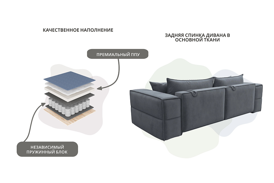 Пенополиуретан обеспечивает плавность и удобство форм, комфорт во время эксплуатации. Комбинация из разного типа тканевых волокон продлевает срок службы. Верхняя мебельная ткань имеет эффектный внешний вид и отличается простотой в уходе. - Средний размер