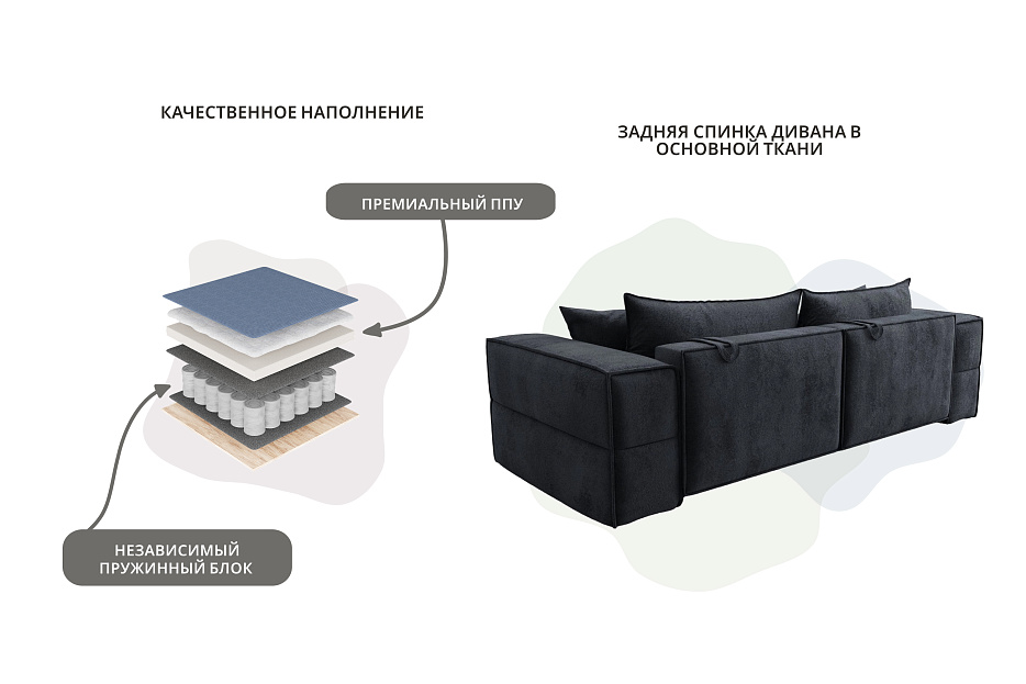 Пенополиуретан обеспечивает плавность и удобство форм, комфорт во время эксплуатации. Комбинация из разного типа тканевых волокон продлевает срок службы. Верхняя мебельная ткань имеет эффектный внешний вид и отличается простотой в уходе. - Средний размер