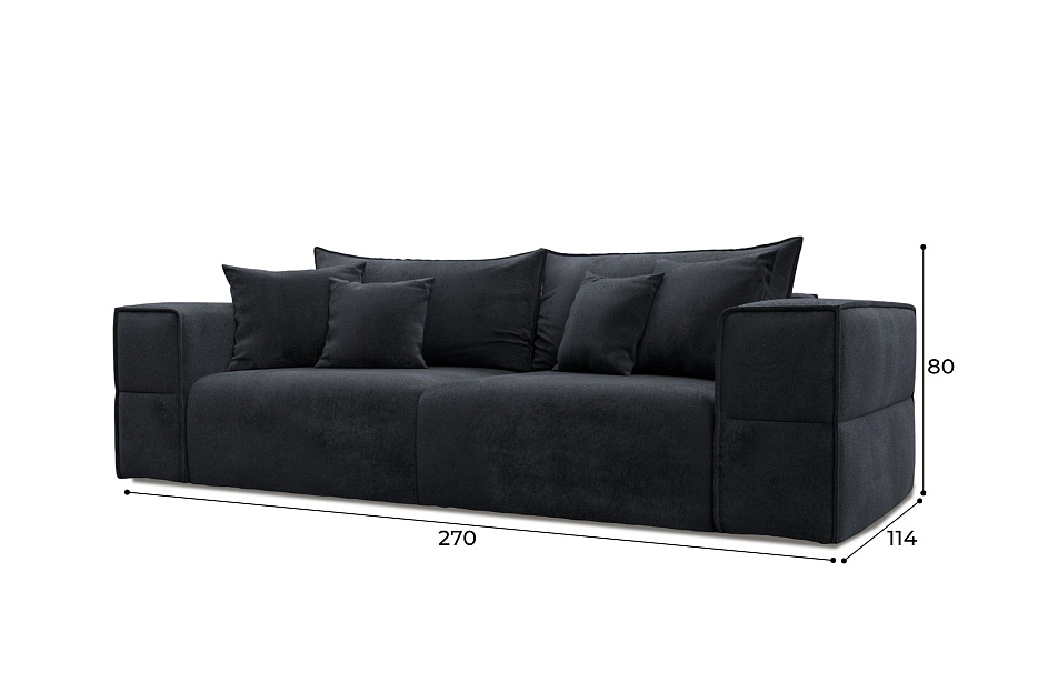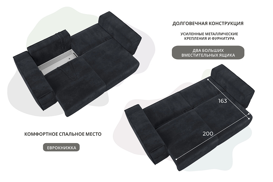 При габаритах: 270х80х114 см подойдет для комнат любых размеров, легко раскладывается, обеспечивая спальное место 163x200 см.