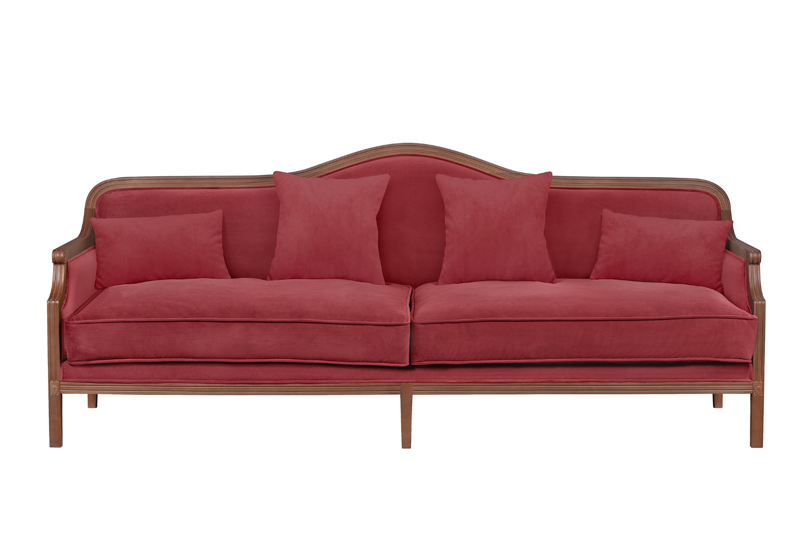Запросить индивидуальное предложениеЧетырехместный красный диван с обивкой из велюра Madesta Red выполнен в приятных тонах на основе прочного каркаса из массива бука. Поверхность модели почти полностью покрывает обивка красного цвета, приятная на ощупь и устойчивая к истиранию. Изящный деревянный контур с грациозными изгибами, проходящий по всему периметру изделия, в нескольких местах декорирован резьбой. Высокая спинка с волнообразным верхом плавно переходит в боковые стенки, закругляясь по бокам. На широком горизонтальном основании располагается пышное сиденье. Длинные прямые ножки гармонично вписываются в общий дизайн и подчеркивают элегантность изделия.