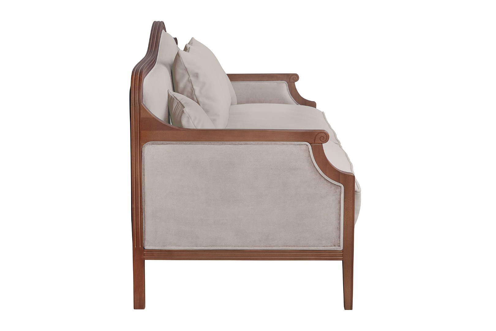В комплекте с моделью поставляются четыре декоративные подушки – две квадратных и две, поменьше размером, прямоугольной формы. Диван идеально подходит для обустройства спален и гостиных, выдержанных в классическом или винтажном стиле.