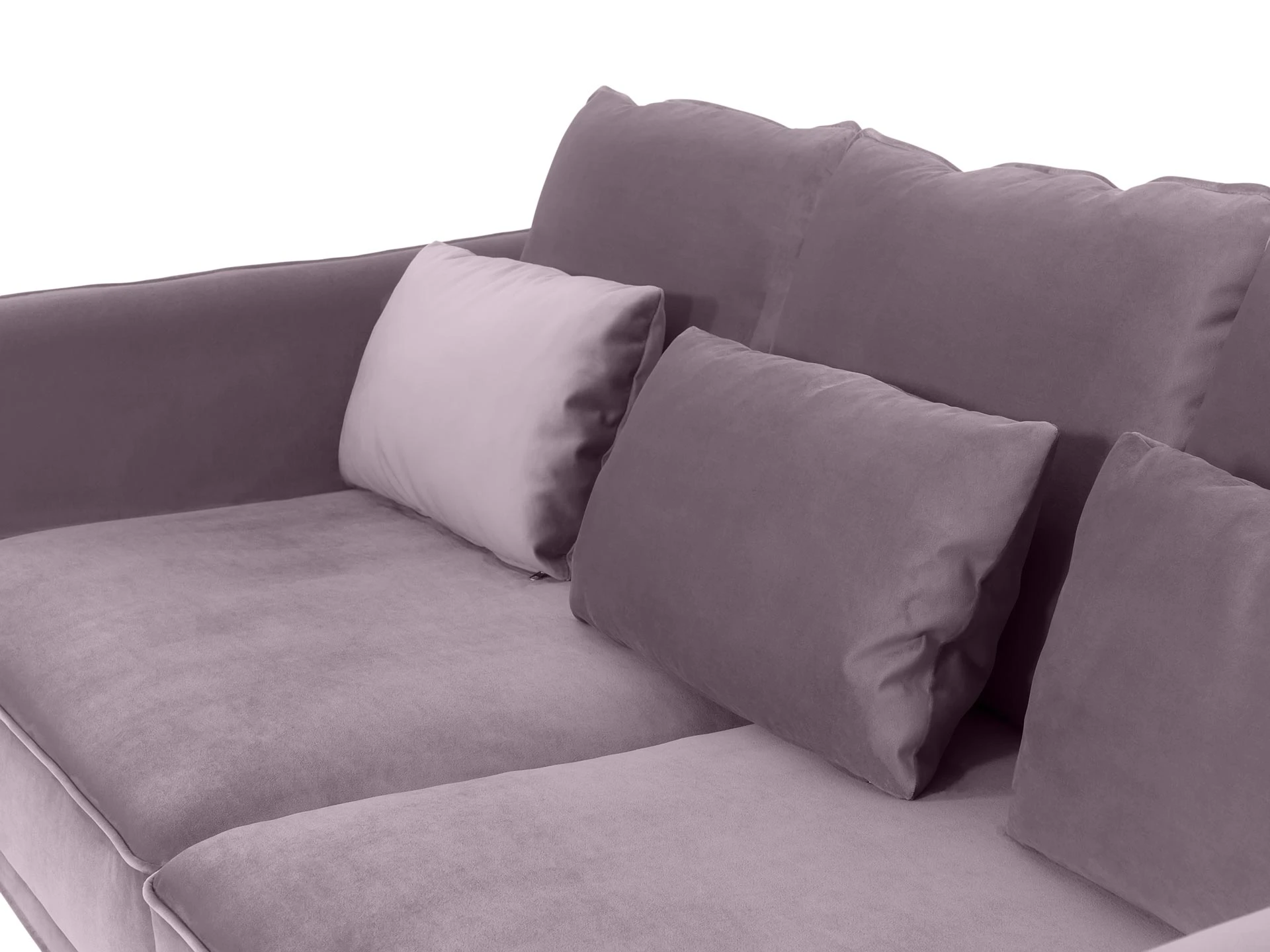 Диван укомплектован шестью подушками, которые входят. Подушки сиденья состоят из пружинного блока, войлочного настила, нескольких слоев пенополиуретана. Материал нового поколения гипоаллергенен и экологически безопасен. Его ячеистая структура обладает повышенной прочностью и «анатомической» памятью. Не проминается, моментально восстанавливает форму.