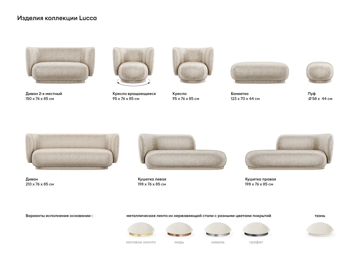 Эти великолепные модели подарят теплые тактильные ощущения. С помощью Lucca можно стильно оформить как домашнюю гостиную, спальню, детскую, так и креативное пространство, творческую студию, галерею, салон, лаундж-зону, бутик. Настоящее олицетворение гедонизма, красоты и элегантности. Предметы из коллекции гармонично комбинируются между собой, а также хорошо дружат с другими элементами разных стилистических направлений.