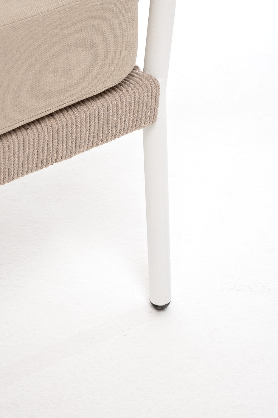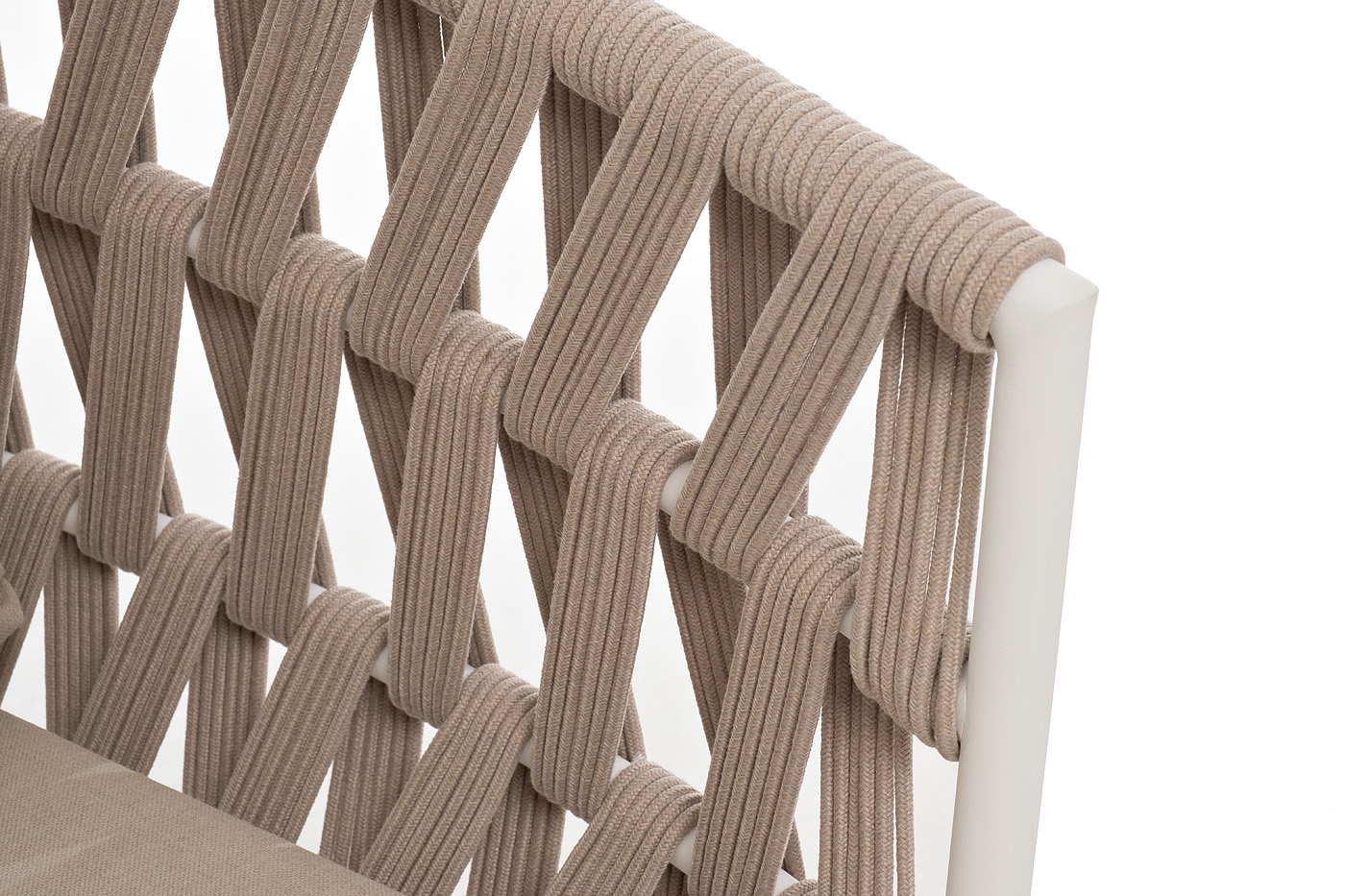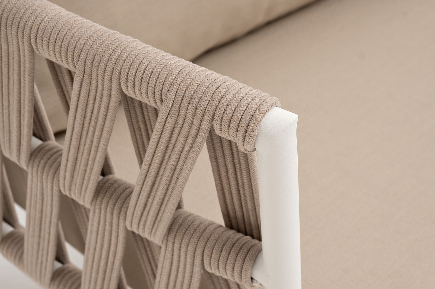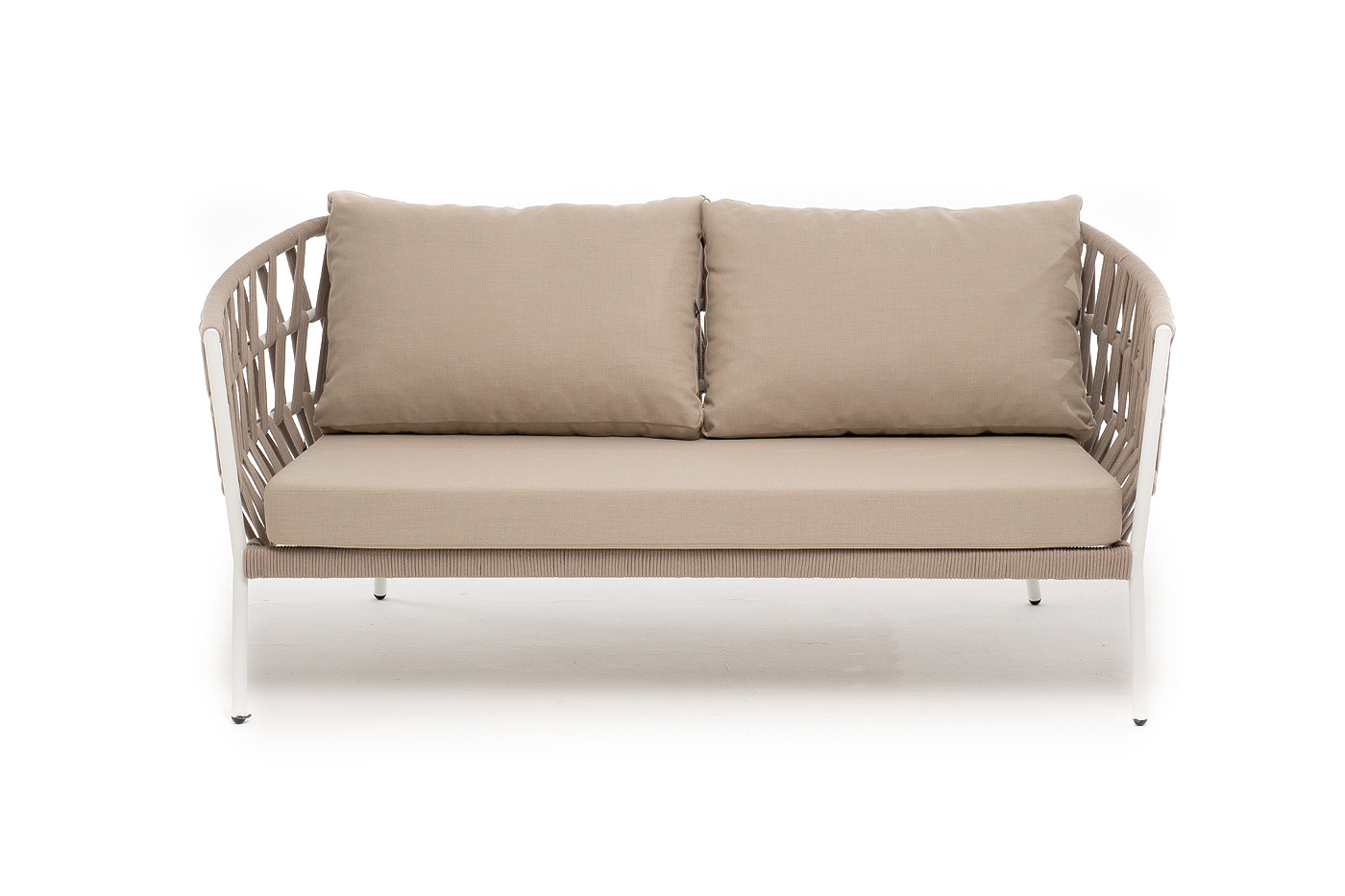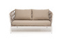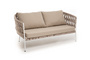 "Диего" диван 2-местный плетеный из роупа, каркас алюминий белый муар, роуп бежевый круглый, ткань бежевая 035